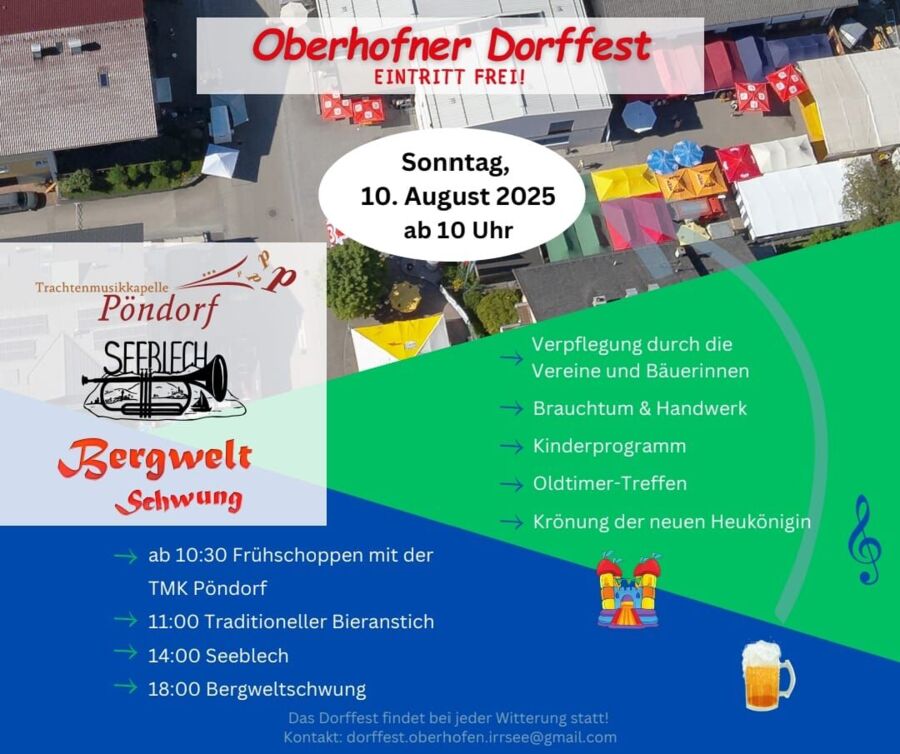Wir laden alle herzlich ein, einen gemütlichen, musikalischen und unterhaltsamen Tag mit uns zu verbringen. Das Oberhofner Dorffest – ein Fest für Jung und Alt. Wir freuen uns auf euer Kommen. Das Dorffest findet bei jeder Witterung statt.