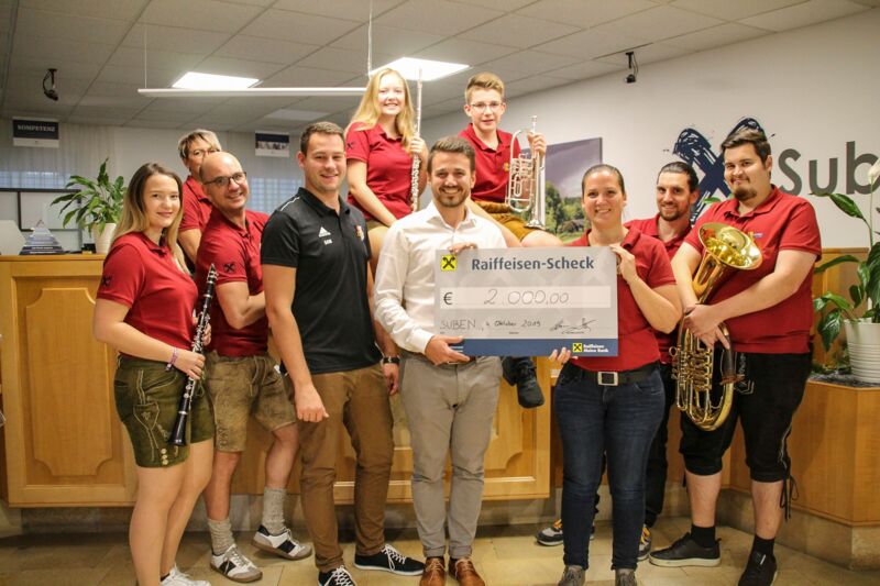 Im Sommer 2019 wurde die Musikkapelle Suben neu adjustiert – und zwar mit praktisch-feschen neuen Musipolos! Ermöglicht hat diese Anschaffung eine großzügige Spende der Raiffeisenbank Suben. Nun war endlich Scheckübergabe!