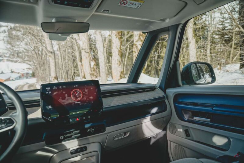 Das setzt sich im Interieur auch fort. VW verkniff sich hier sinnbefreite Retrozitate á la Vase im Beetle, zelebriert den ID-klassischen coolen und reduzierten Stil. Kleine digitale Anzeige hinter dem Lenkrad, großer zentraler Touchscreen und ganz viel gefühlten und tatsächlichen Freiraum. Der Rundumblick im Buzz ist sensationell, dazu die Erhabenheit der erhöhten Sitzposition und die saubere Verarbeitung, fertig ist ein hoher Wohlfühlfaktor. Daran ändern auch die fummeligen und unbeleuchteten Touchslider nichts.