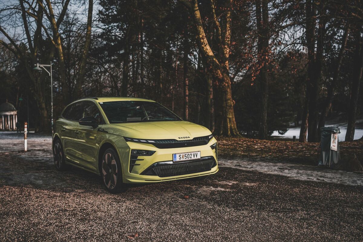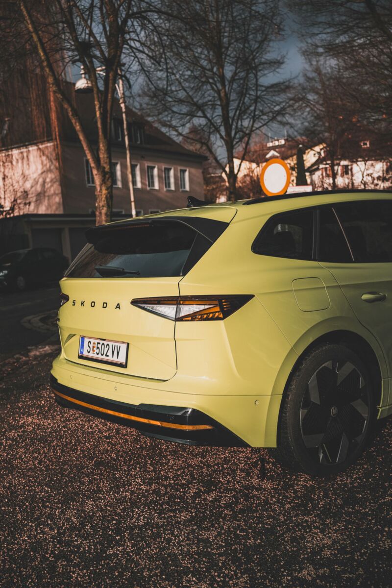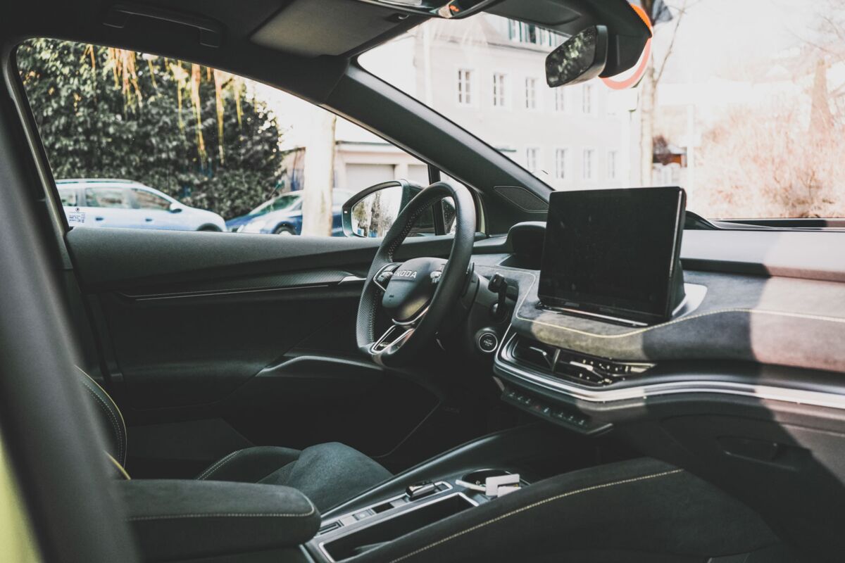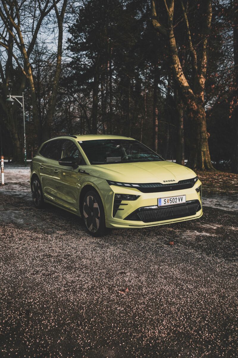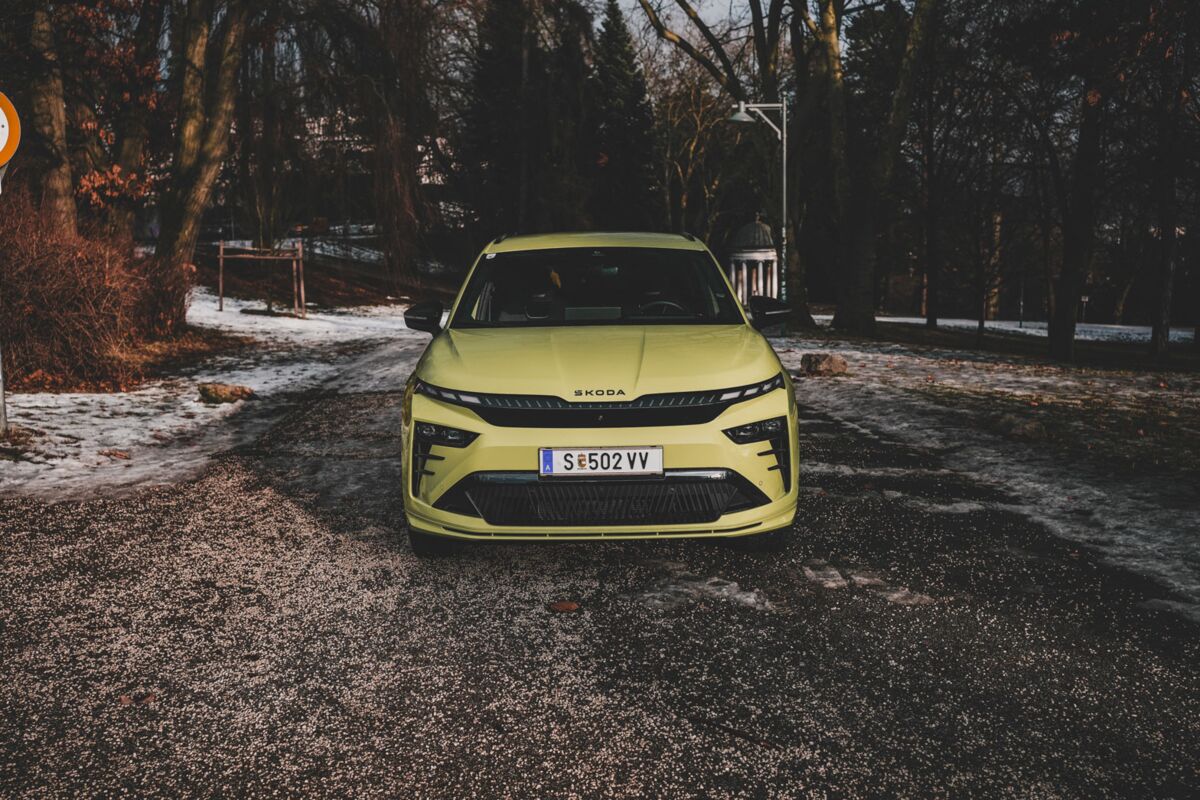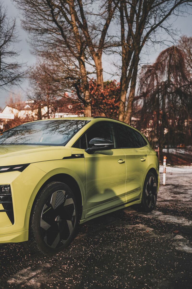 Von dem her können wir jetzt gar nicht sagen, ob die vielen Blicke der im Zuge des letzten Facelifts komplett neu gestalteten Front oder der „Mamba Grün“ Lackierung samt 21“ Felgen gegolten haben. Wir tippen auf beides, weil der an den neuen Elroq angelehnte Look schon so viel Charakter hat um neben schreienden Farben und extrovertierten Felgen zu bestehen. Wer auf Nummer sicher gehen will – es gibt den Enyaq RS eh auch in „Stahl Grau“, die 21-Zöller sind optional.