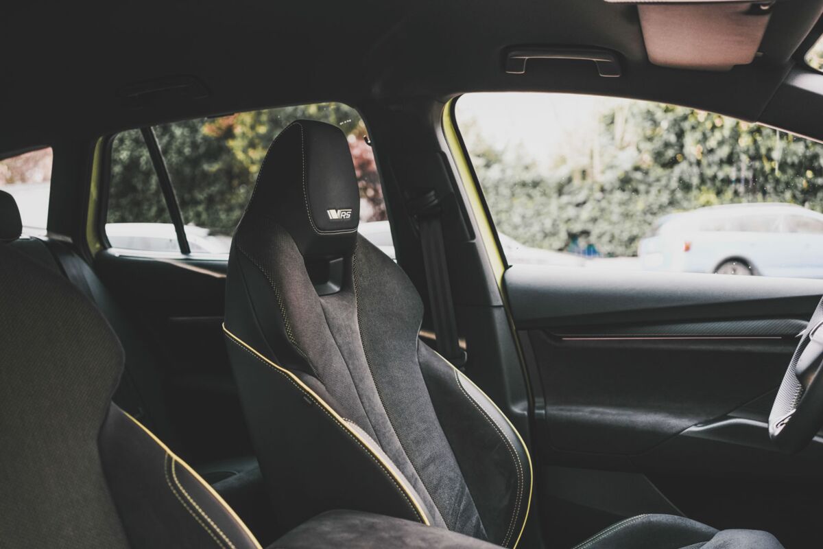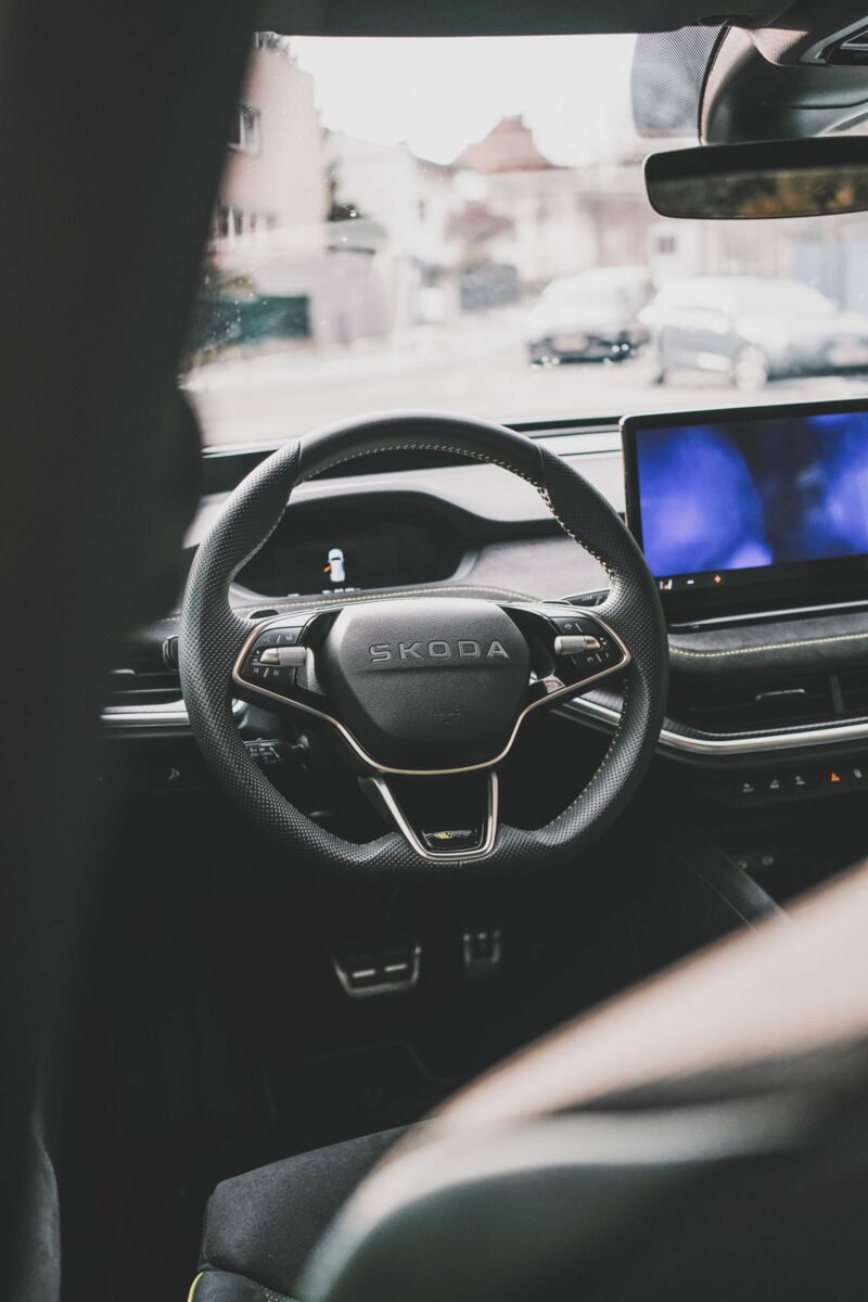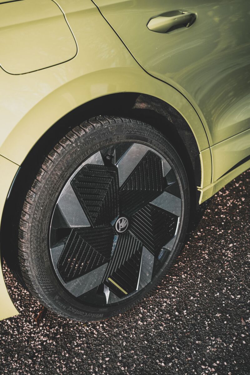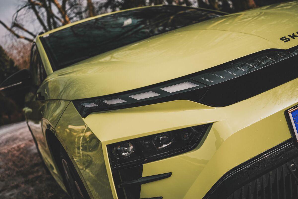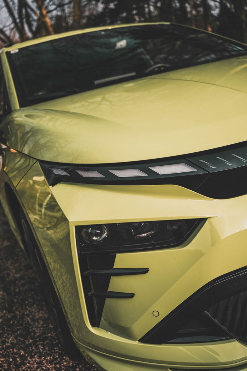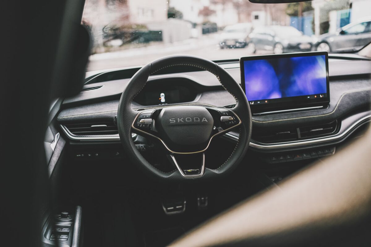 Von dem her können wir jetzt gar nicht sagen, ob die vielen Blicke der im Zuge des letzten Facelifts komplett neu gestalteten Front oder der „Mamba Grün“ Lackierung samt 21“ Felgen gegolten haben. Wir tippen auf beides, weil der an den neuen Elroq angelehnte Look schon so viel Charakter hat um neben schreienden Farben und extrovertierten Felgen zu bestehen. Wer auf Nummer sicher gehen will – es gibt den Enyaq RS eh auch in „Stahl Grau“, die 21-Zöller sind optional.