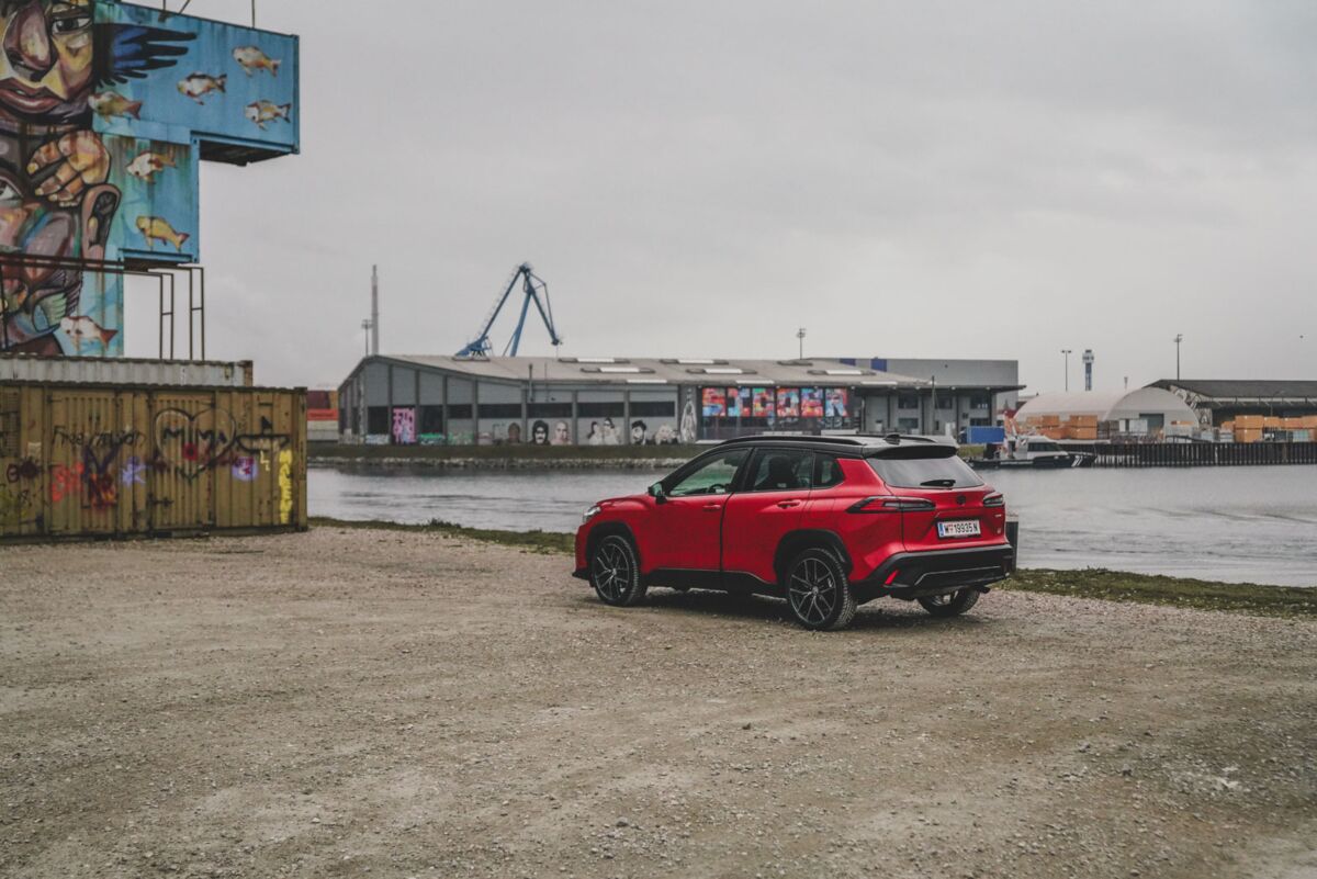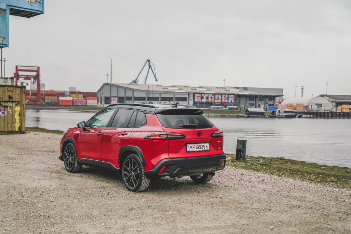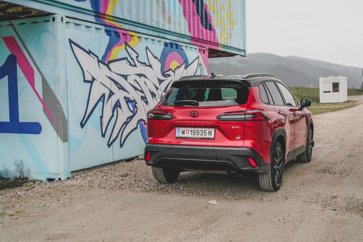 Toyota hat sich vom Biedermeier zum Brandstifter gemausert, und weil die Japaner in ihrer Konsequenz unnachahmlich sind, machten sie dabei auch vor ihrem an sich kreuzbraven SUV-Bestseller Corolla Cross nicht halt. Ergo dessen auch unser Testmodell in der ab sofort erhältlichen „GR Sport“ erhältlichen Variante. Als Aufreger hätte dabei schon die Bi-Tone Lackierung in „Emotional Red“ samt Dach in „Night Sky Black“ gereicht, es gibt trotzdem noch schwarze 19-Zoll Felgen, eigens designte Stoßfänger und dezente Tieferlegung obendrauf.