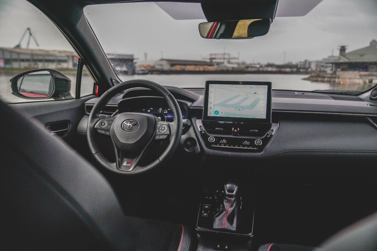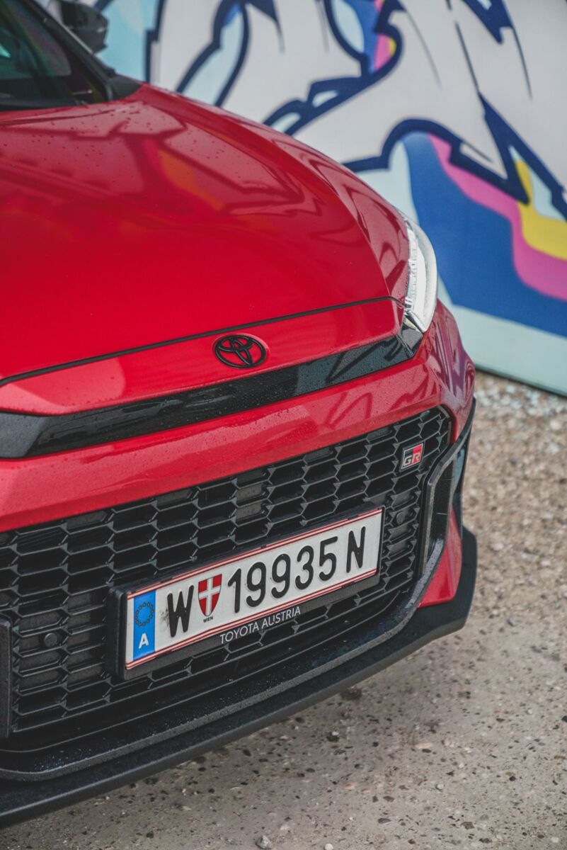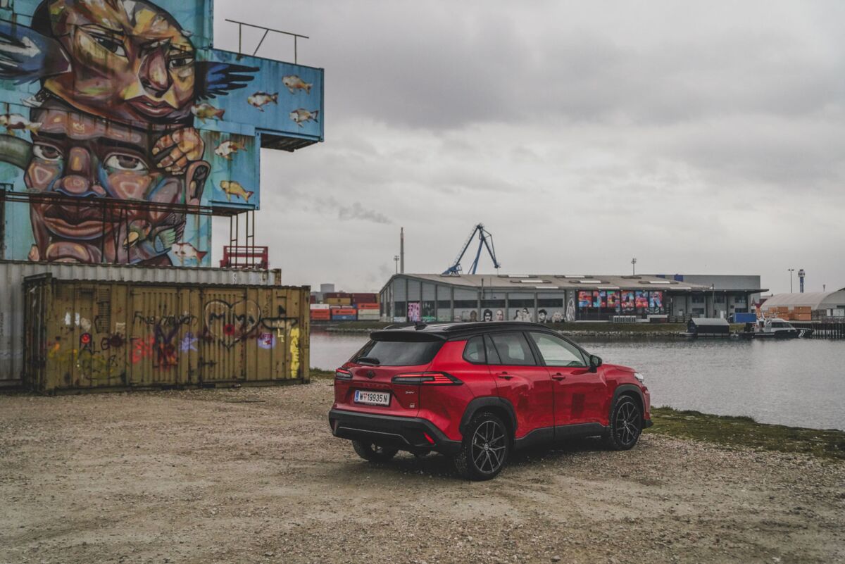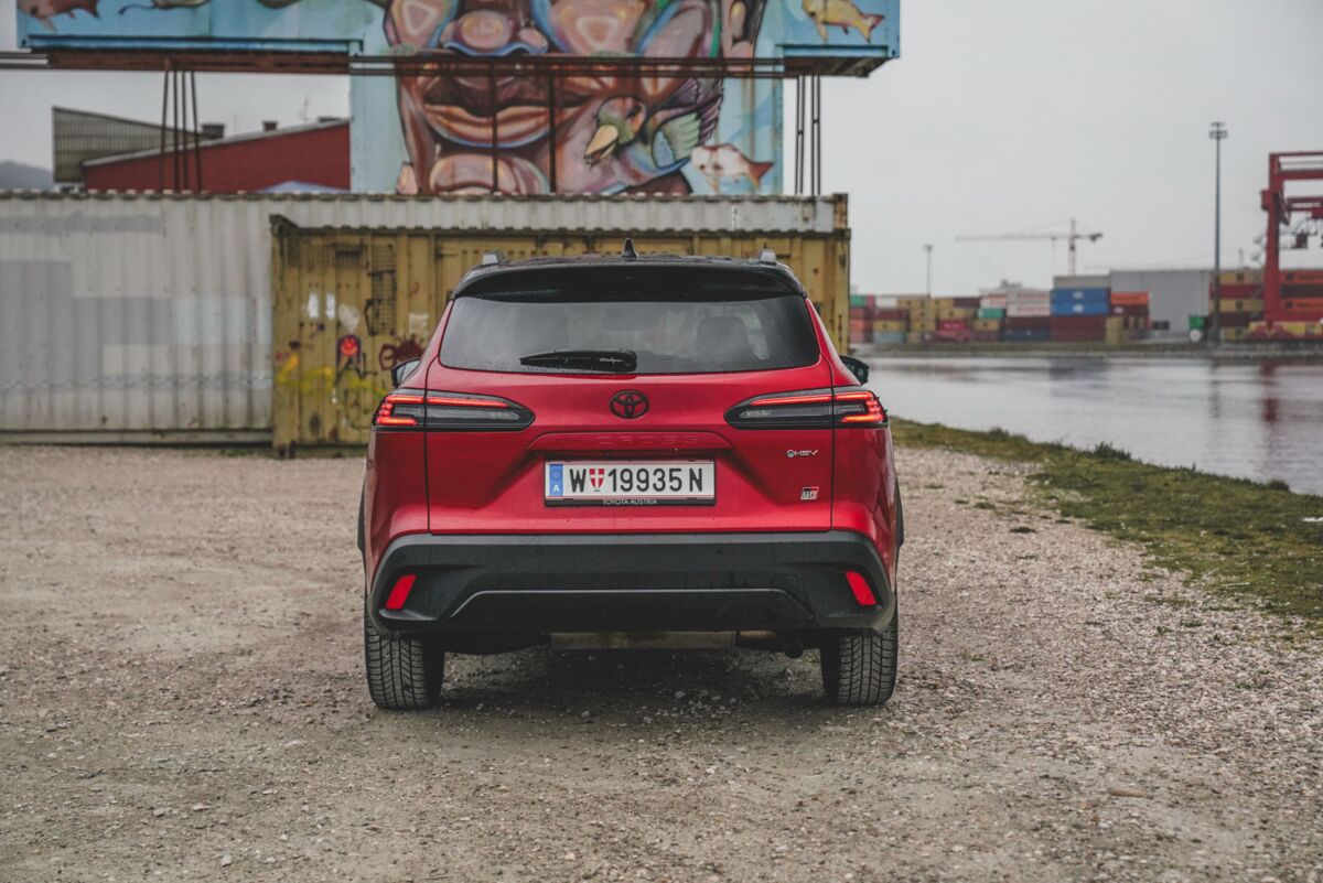 Toyota hat sich vom Biedermeier zum Brandstifter gemausert, und weil die Japaner in ihrer Konsequenz unnachahmlich sind, machten sie dabei auch vor ihrem an sich kreuzbraven SUV-Bestseller Corolla Cross nicht halt. Ergo dessen auch unser Testmodell in der ab sofort erhältlichen „GR Sport“ erhältlichen Variante. Als Aufreger hätte dabei schon die Bi-Tone Lackierung in „Emotional Red“ samt Dach in „Night Sky Black“ gereicht, es gibt trotzdem noch schwarze 19-Zoll Felgen, eigens designte Stoßfänger und dezente Tieferlegung obendrauf.