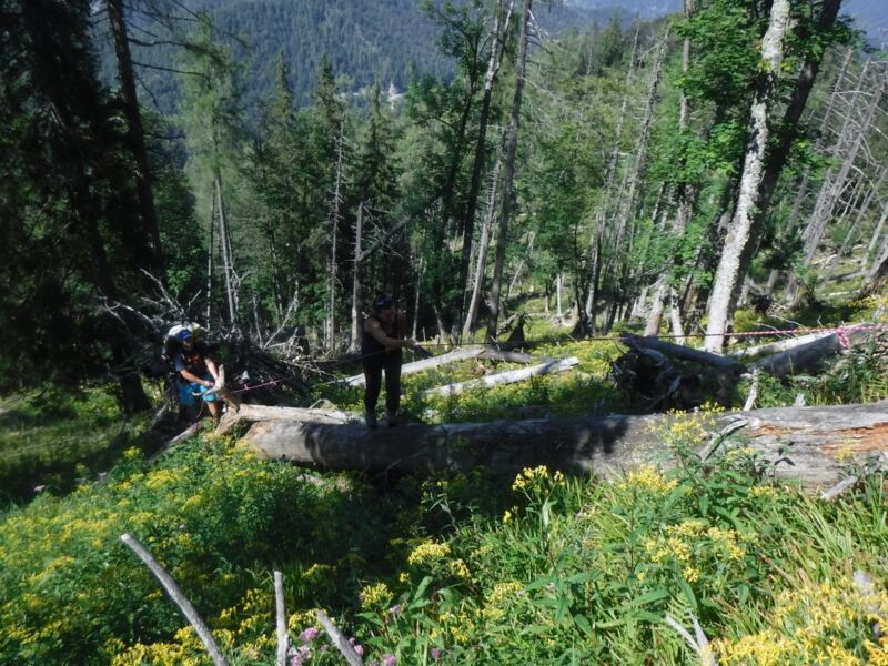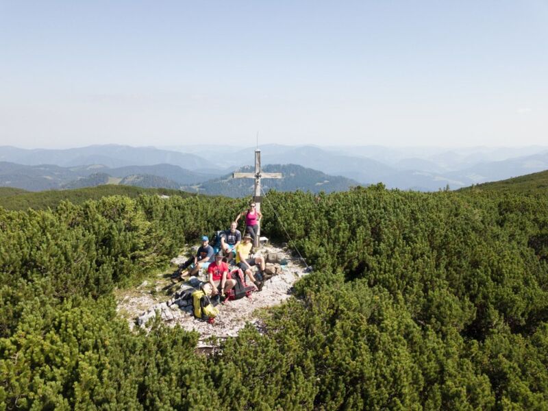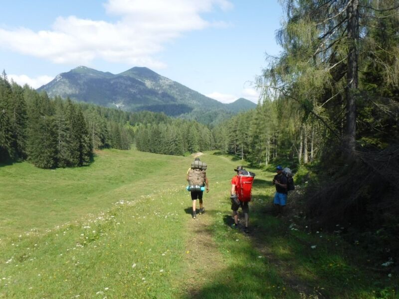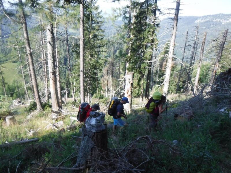 Um jedoch dorthin zu gelangen, mussten wir zuerst die Zivilisation hinter uns lassen. Mit dem noch ungewohnten schweren Gepäck am Rücken durchquerten wir Windischgarsten und folgten dem Leitersteig hinein in den Nationalpark Kalkalpen. In den nächsten Tagen legten wir viele Kilometer auf unterschiedlichsten Untergründen zurück. Die bestehenden Wanderwege machten uns das Weiterkommen einfach und waren immer Teil unserer Tagesetappen. Wo es jedoch ging, wichen wir auf verwilderte Wege und wegloses Gelände aus. Ob es nun der kurze Abstecher in den verlassenen Schafgraben, der Abstieg vom Größtenberg durch das steile Ahorntal oder eine schöne Gratwanderung entlang vom Langfirst war, es hatten alle Etappen ihren Reiz und ihre Herausforderungen.