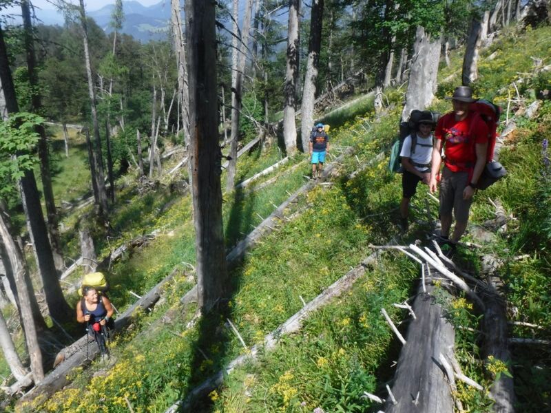 Unter diesem Motto stand meine erste Wildnistrekking-Tour in den Nationalpark Kalkalpen Anfang August. In einer kleinen Gruppe durchstreiften wir das Reichraminger Hintergebirge jenseits der bekannten Wanderwege und folgten verwilderten Forststraßen, rauschenden Bächen und verlassenen Tälern.