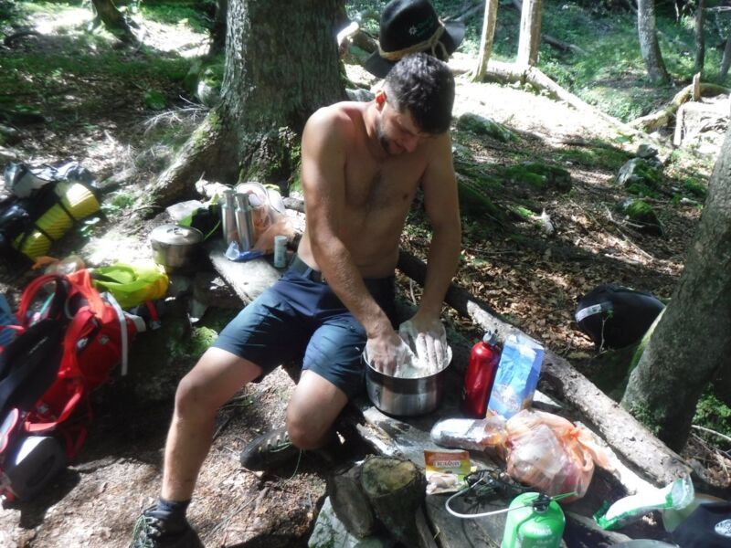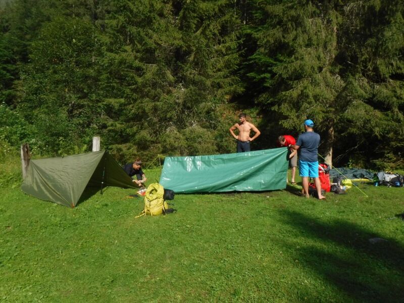 Auch vor und nach den jeweiligen Tagesetappen gab es viel zu tun. Das Lager mitsamt Tarps zum Schlafen wurde abends auf- und morgens wieder abgebaut. Holz hacken und ein Lagerfeuer entfachen, das Frühstück und Abendessen kochen oder den eigenen Rucksack aus-, ein- und umpacken. Neben diesen Tätigkeiten blieb aber auch noch genug Zeit um die kalten Gebirgsbäche mitsamt den einladenden Badebottichen im Sonnenschein zu genießen oder bei Feuerschein auf die Sterne zu warten.