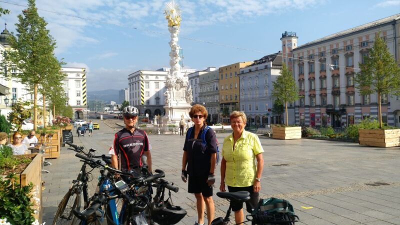 Pensionisten aus St.Florian testeten den Radweg durch Linz. An einem Donnerstag fahren sie nur auf Radwegen und Radfahrstreifen durch Linz. Es war viel Autoverkehr am Nachmittag, doch sie schafften die 23 Ampeln ganz gut. Etwa die Hälfte zeigten ROT an, also warten. Von der Bethlehemstrasse an fuhren sie humpelnd auf der Landstrasse über das Stöckelpflaster, zum Hauptplatz. Die Abfahrt von der Nibelungenbrücke zum Kunstmuseum ist eine Zumutung, sehr schmal für Radfahrer und Fußgänger. Belohnung aber auf dem neuen Radweg der VÖEST-Brücke, doch bei viel Radverkehr wieder relativ schmal, wenn man stehen bleibt um zu Fotogravieren.