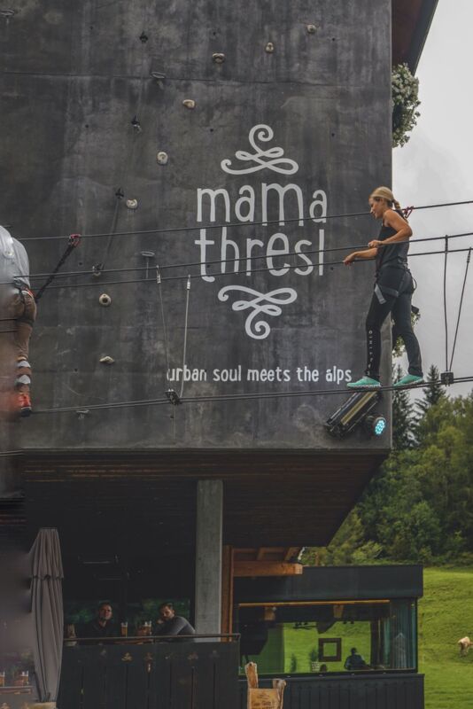 Das mama thresl zeigt seinen Sinn für Einzigartigkeit gleich bei der Ankunft: An der Fassade des schönen Holzbaus sowie im Eingangsbereich des Hotels wurde für die sportbegeisterten Gäste ein Klettersteig installiert. Ausgerüstet mit einem Klettersteigset, das man sich im Hotel ausleihen kann, und Tipps von den Profis lässt sich ausgehend von einem Felsen die Außenwand des Gebäudes bis ganz hinauf aufs Dach erklimmen. Auch im Inneren kann man über vom Startpunkt neben der Rezeption die Kletterwand bis zur Dachterrasse hinauf kraxeln. Wer sich über diesen Adrenalinkick drüber traut wird oben angekommen mit Getränken belohnt. Unter dem Dach befindet sich ein Kühlschrank mit urban Drinks, die man sich ganz entspannt – eben im mama thresl style – selbst nach Belieben entnehmen kann. Bezahlt wird auf Vertrauensbasis, indem die Gäste ein Zettelchen mit ihrer Konsumation in einer Box bei der Selbstbedienungsstation zurücklassen. Von uns gibt´s einen Daumen hoch für dieses Trust-Konzept!