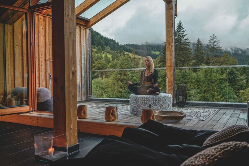Nach unserer erfrischenden Wanderung ziehen wir uns im obersten Stock von mama thresl in den Wellness-Bereich zurück. Hier wärmen wir uns in der großzügigen finnischen Saune mit Blick auf die Berge wieder so richtig auf und entspannen danach in den mit Fell ausgelegten „Chill-Out-Höhlen“.