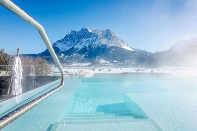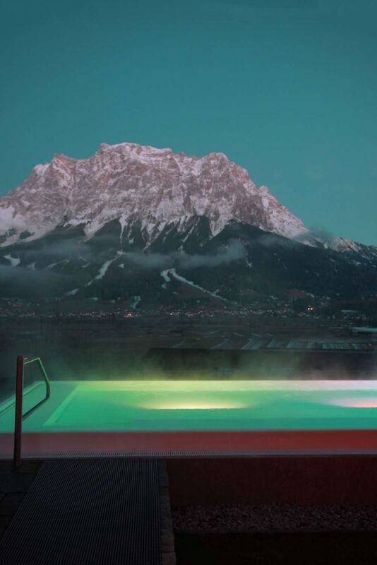 Hier glänzt ein - mittlerweile - „Must Have“ ganz neu interpretiert: Ein Infinity Pool mit warmer Alpensole. Hier schwebt man quasi wie auf Wolken der Bergwelt entgegen. Ein weiterer großzügiger Pool bietet Gelegenheit zum In- & Outdoor Schwimmen, die Saunawelt mit Tiroler Schwitzstube, Laconium, Dampfbad und eine Eisgrotte mit Tauchbecken versprechen Spa-Liebhabern eine Wellnessauszeit auf höchstem Niveau. Besonders gefallen hat uns der „Adults only“ Bereich. Im Zirben Sauna Haus haben wir es genossen, mehrere Aufgüsse mitzumachen und danach im Ruheraum mit loderndem Kaminfeuer und Zugspitzblick zu entspannen. Dies war der für uns perfekte Ort, um echte, nachhaltige Erholung zu erleben. Tiroler Charme meets Zen.
