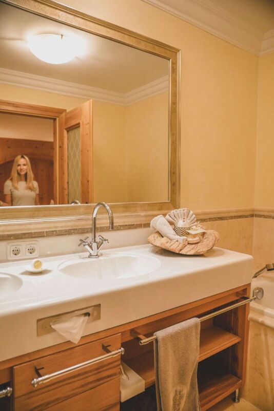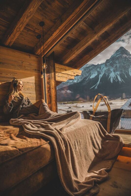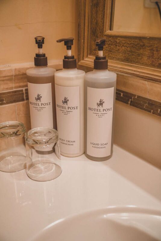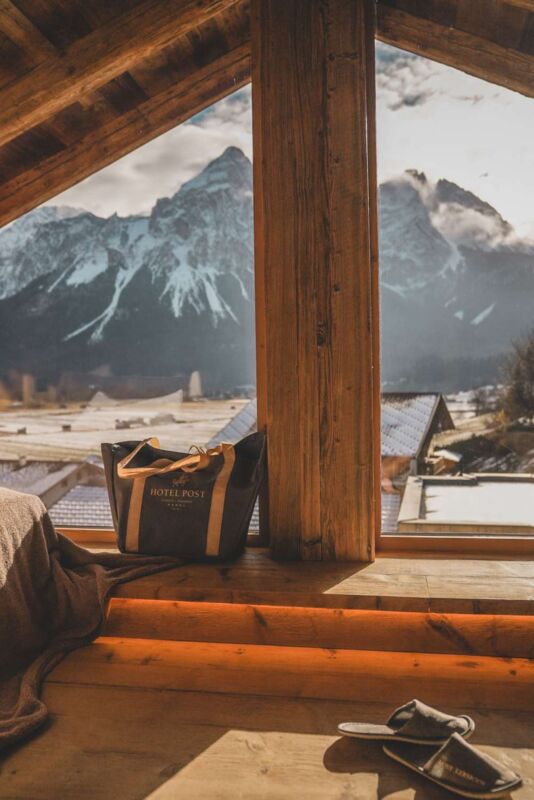 Das Hideaway am Fuße der Zugspitze in Lermoos begrüßt mit 59 Suiten im Tiroler Stil. Von dem einstigen Lazarett ist natürlich nichts mehr zu sehen, doch das Posthotel legt auch heute noch großen Wert auf seine über 450 Jahre alte Geschichte. Beim Design wurde großer Wert auf heimische Hölzer, hochwertige Stoffe und einen gemütlichen Kachelofen als zentraler Mittelpunkt gelegt. Das Highlight: Ein freier Blick auf die imposante Bergkulisse von unserer Terrasse. Kleine aber feine Details zeigen, dass hier Individualität gelebt wird: Bei Anreise warten hausgemachte Pralinen, eisgekühlter Champagner und eine handgeschriebene Begrüßungskarte in unserer Suite auf uns.
