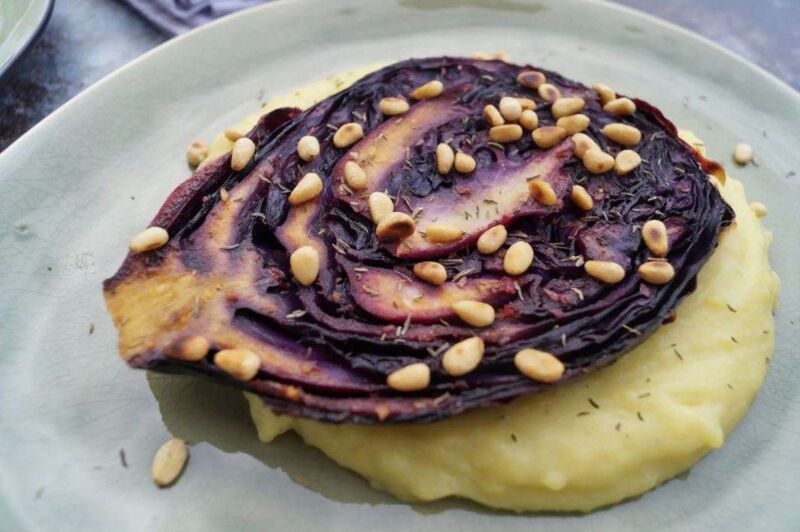 „Steaks“ vegan? Das geht doch gar nicht – und ob! Wir halten ja nicht so viel von den veganen Fertigprodukten mit zahlreichen Geschmacksverstärkern. Als pflanzliche Alternative greifen wir hierbei zu Rotkraut und bereiten dieses einmal ganz anderes zu als üblich. Eine intensive Marinade und geröstete Nüsse sorgen für eine wahrliche Geschmacksexplosion. Zu dem feinen Stück, servieren wir ein cremiges Kartoffelpüree mit einem Hauch von Muskatnuss.