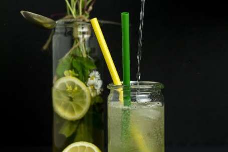 - Mit Mineralwasser auffüllen und frischen Kräuterzweigen dekorieren.