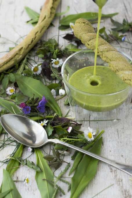 - 2 Handvoll Wildkräuter (z.B.: Brennnessel, Vogelmiere, Giersch ect.) gut waschen und grob schneiden.