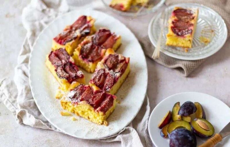 - Zwetschken entsteinen, in Spalten schneiden mit Zitronensaft sowie Zimt vermengen und abgedeckt beiseite stellen.