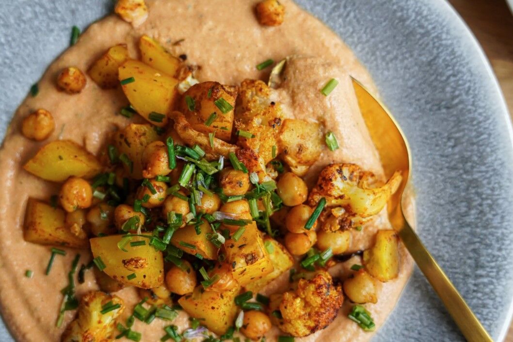 - Die geröstete Gemüsesauce auf einem flachen Teller verteilen und mit dem Ofengemüse aus Blumenkohl und Kartoffeln anrichten. Mit frischem Schnittlauch garnieren.