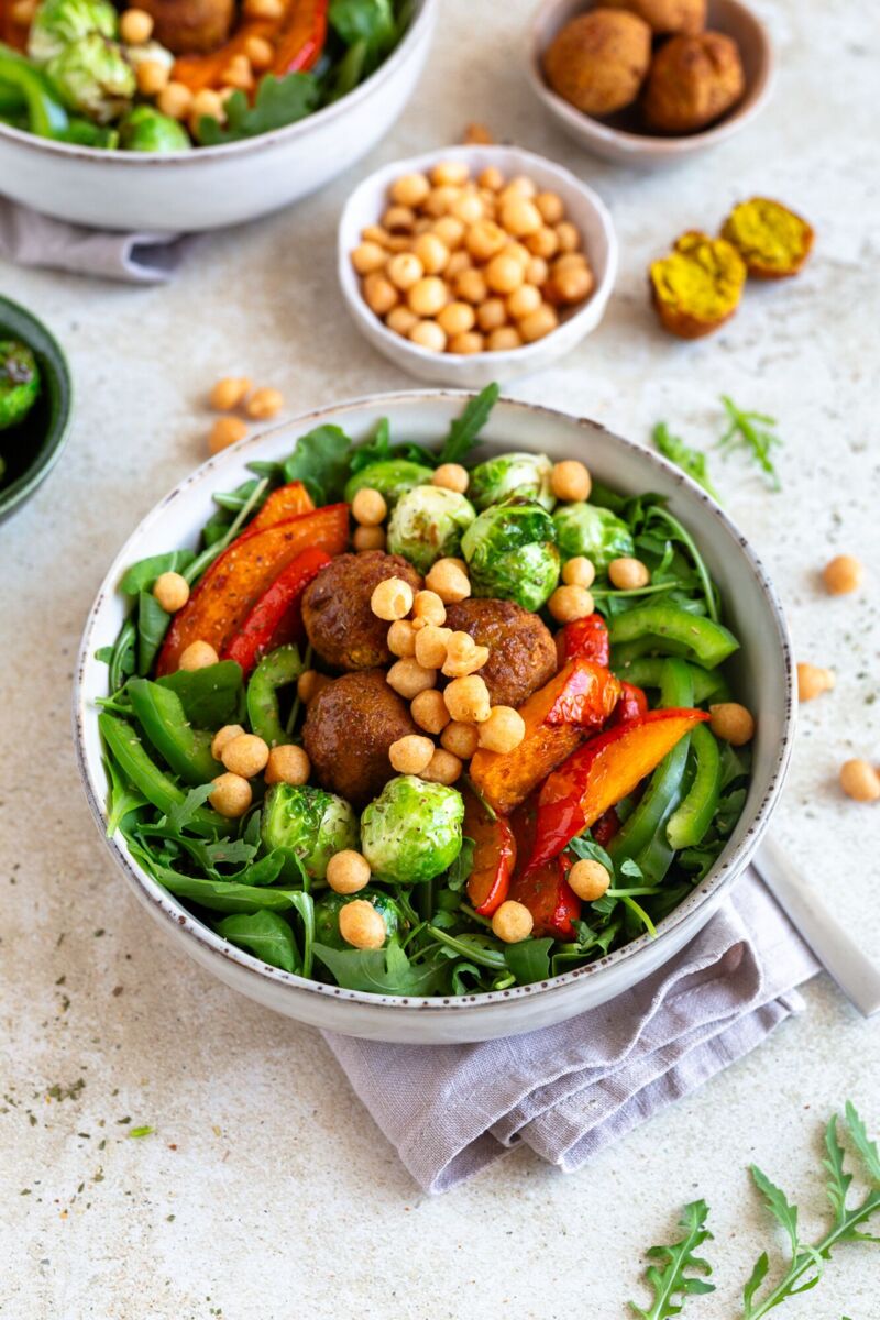 Abschließend die Bio Dinkel Backerbsen als knuspriges Topping darüberstreuen. Falafel, Ofengemüse und Dressing 2–3 Tage vorher zubereiten und gekühlt lagern.