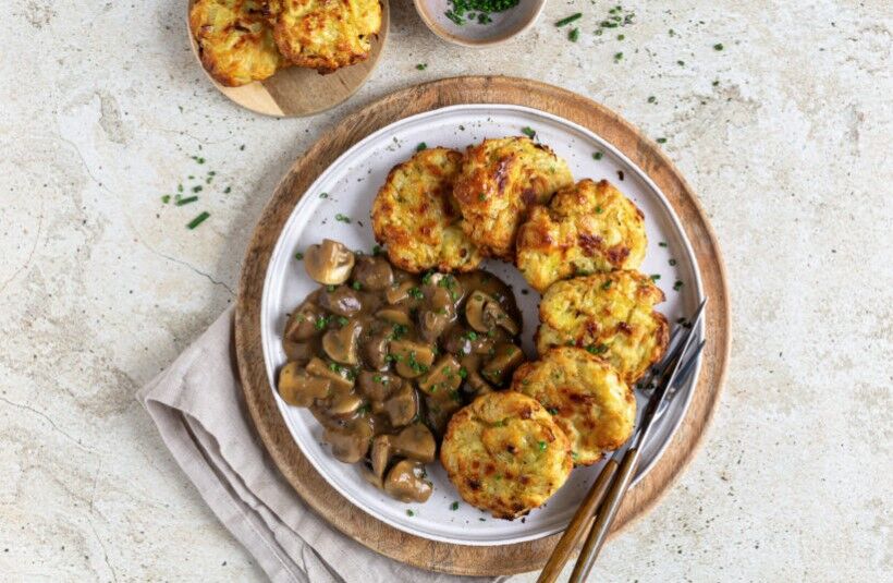 Masse herstellen: Kohlrabi und Kartoffeln grob raspeln, mit dem Salz vermengen und 5 Minuten stehen lassen. Anschließend überschüssige Flüssigkeit mit den Händen gut ausdrücken.