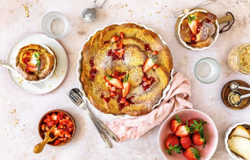 - Den Striezlauflauf aus dem Backofen nehmen und mit Erdbeersauce sowie frischen Erdbeerstücken garnieren.