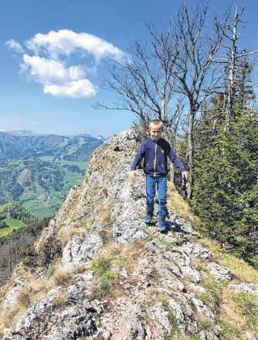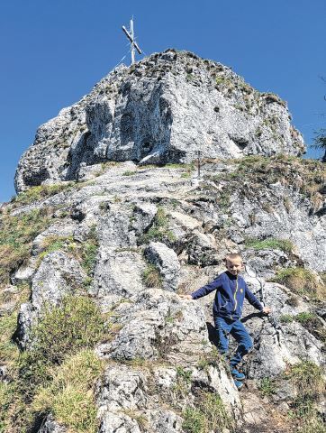 Vom nächsten Grataufschwung grüßt bereits das Gipfelkreuz vom „Steinernen Jäger“, ein der Sage nach für seine Frevel bestrafter, zu Fels erstarrter Jäger. Von links mündet die Route E72/AV25 vom „Gschoad“ ein, welche wir als Abstieg benutzen werden (1.030 m). Nach 10 Minuten erreichen wir den unmittelbaren Gipfelgrat und in weiteren 10 Minuten stehen wir in der Scharte vor dem senkrecht abstürzenden Gratzacken des „Steinernen Jägers“. Eine kurze Eisenstange, Haltebügel und Stahlseile sichern den etwas heiklen Übergang zum Gipfelkreuz, 1.185 m – 2 Stunden.