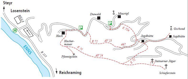 Für den Abstieg gehen wir vorerst den gleichen Weg zurück bis zur Abzweigung Losenstein E72/AV25 und queren anschließend den Nordhang des Schiefersteins in östlicher Richtung. Bald quert eine neue Forststraße. Auf ihr ließe sich der weitere Abstieg durch die bewaldete Steilflanke (bei Nässe Rutschgefahr) zu einer Jagdhütte nahe der Abzweigung „Gschoad“ recht angenehm umgehen. Dahinter Abstiegsmöglichkeit auf E72a zu einem weiteren kleinen Parkplatz am Güterweg Schieferstein zwischen den Gehöften Diwald und Miesriegl (kürzeste und leichteste Variante zur Schiefersteinbesteigung). Wir halten uns jedoch an die Hauptroute E72 (AV25 und 467, Parkplatz Hack 35 Min.) und erreichen nach kurzem Forststraßenmarsch und schönen Waldwegen eine große Viehweide, über die mit schönen Ausblicken ins Ennstal wieder zum Güterweg Schieferstein abgestiegen wird.