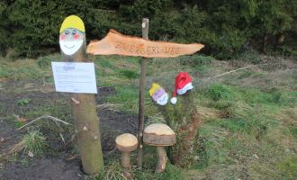 Leicht verwirrend erscheinen am kleinen Parkplatz die Wegschilder zum Schieferstein mit völlig konträren Richtungspfeilen: Nach rechts führt E71/AV24 über den Pfennigstein und links die etwas leichtere Route E72/AV25 übers „Gschoad“ (beide mit gleicher Zeitangabe 2 Std. und 10 Min.), die sich als Abstieg besser eignet.