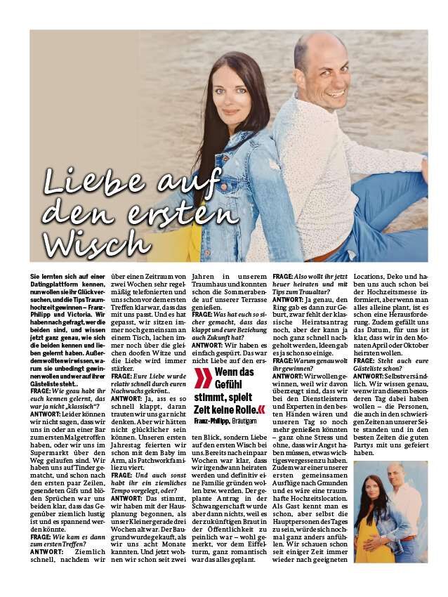 Zusätzlich zum Bild, wo leider in der Eile vier Tippfehler eingebaut wurden: FRAGE: Wie genau habt ihr euch kennen gelernt, das war ja nicht „klassisch“? ANTWORT: Leider können wir nicht sagen, dass wir uns in oder an einer Bar zum ersten Mal getroffen haben, oder wir uns im Supermarkt über den Weg gelaufen sind. Wir haben uns auf Tinder gematcht, und schon nach den ersten paar Zeilen, gesendeten Gifs und blöden Sprüchen war uns beiden klar, dass das Gegenüber ziemlich lustig ist und es spannend werden könnte. FRAGE: Wie kam es dann zum ersten Treffen? ANTWORT: Ziemlich schnell, nachdem wir über einen Zeitraum von zwei Wochen sehr regelmäßig telefonierten und uns schon vor dem ersten Treffen klar war, dass das mit uns passt. Und es hat gepasst, wir sitzen immer noch gemeinsam an einem Tisch, lachen immer noch über die gleichen doofen Witze und die Liebe wird immer stärker. FRAGE: Eure Liebe wurde relativ schnell durch euren Nachwuchs gekrönt.. ANTWORT: Ja, dass es so schnell klappt, daran trauten wir uns gar nicht denken. Aber wir hätten nicht glücklicher sein können. Unseren ersten Jahrestag feierten wir schon mit dem Baby im Arm, als Patchworkfamilie zu viert. FRAGE: Und auch sonst habt ihr ein ziemliches Tempo vorgelegt, oder? ANTWORT: Das stimmt, wir haben mit der Hausplanung begonnen, als unser Kleiner gerade drei Wochen alt war. Der Baugrund wurde gekauft, als wir uns acht Monate kannten. Und jetzt wohnen wir schon seit zwei Jahren in unserem Traumhaus und konnten schon die Sommerabende auf unserer Terrasse genießen. FRAGE: Was hat euch so sicher gemacht, dass das klappt und eure Beziehung auch Zukunft hat? ANTWORT: Wir haben es einfach gespürt. Das war nicht Liebe auf den ersten Blick, sondern Liebe auf den ersten Wisch bei uns. Bereits nach ein paar Wochen war klar, dass wir irgendwann heiraten werden und definitiv eine Familie gründen wollen bzw. werden. Der geplante Antrag in der Schwangerschaft wurde aber dann nichts, weil es der zukünftigen Braut in der Öffentlichkeit zu peinlich war – wohl gemerkt, vor dem Eiffelturm, ganz romantisch war das alles geplant. FRAGE: Also wollt ihr jetzt heuer heiraten und mit Tips zum Traualtar? ANTWORT: Ja genau, den Ring gab es dann zur Geburt, zwar fehlt der klassische Heiratsantrag noch, aber der kann ja noch ganz schnell nachgeholt werden, Ideen gab es ja schon so einige. FRAGE: Warum genau wollt ihr gewinnen? ANTWORT: Wir wollen gewinnen, weil wir davon überzeugt sind, dass wir bei den Dienstleistern und Experten in den besten Händen wären und unseren Tag so noch mehr genießen könnten – ganz ohne Stress und ohne, dass wir Angst haben müssen, etwas wichtiges vergessen zu haben. Zudem war einer unserer ersten gemeinsamen Ausflüge nach Gmunden und es wäre eine traumhafte Hochzeitslocation. Als Gast kennt man es schon, aber selbst die Hauptpersonen des Tages zu sein, würde sich nochmal ganz anders anfühlen. Wir schauen schon seit einiger Zeit immer wieder nach geeigneten Locations, Deko und haben uns auch schon bei der Hochzeitsmesse informiert, aber wenn man alles alleine plant, ist es schon eine Herausforderung. Zudem gefällt uns das Datum, für uns ist klar, dass wir in den Monaten April oder Oktober heiraten wollen. FRAGE: Steht auch eure Gästeliste schon? ANTWORT: Selbstverständlich. Wir wissen genau, wen wir an diesem besonderen Tag dabei haben wollen – die Personen, die auch in den schwierigen Zeiten an unserer Seite standen und in den besten Zeiten die guten Partys mit uns gefeiert haben.