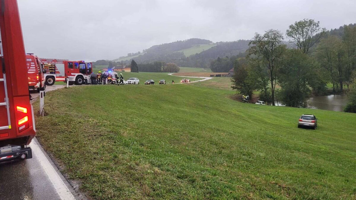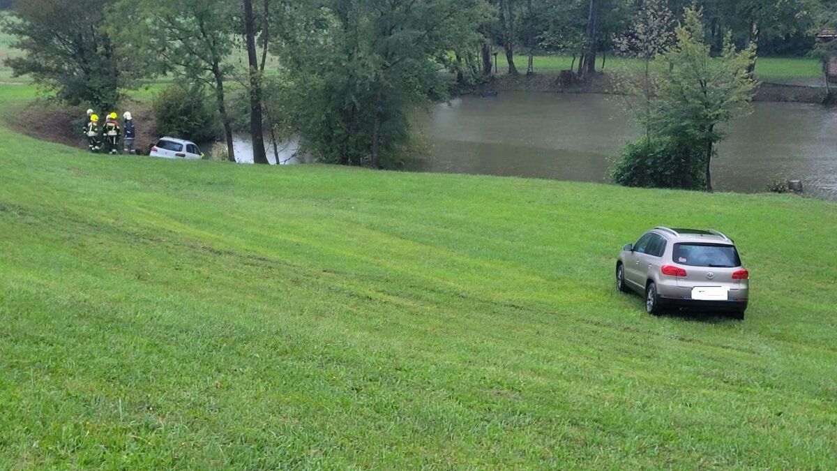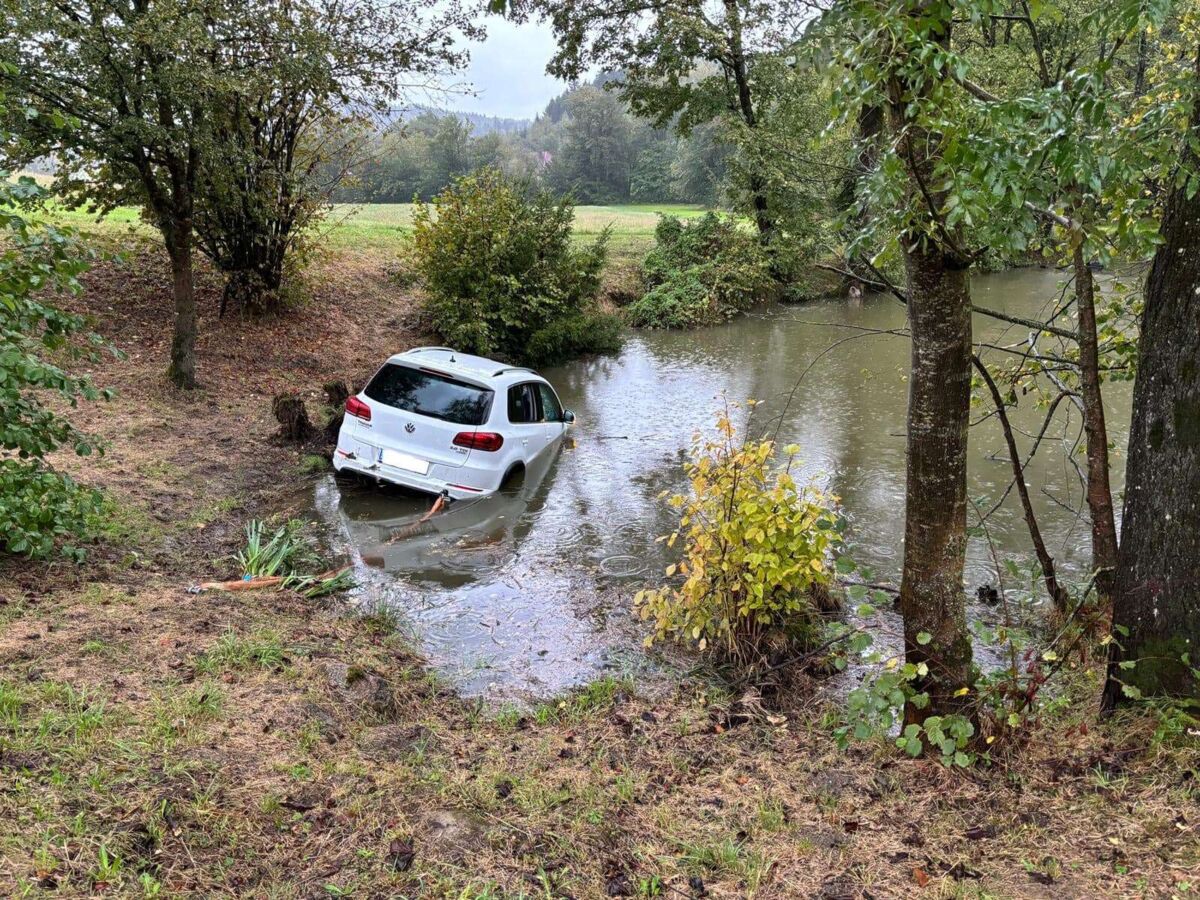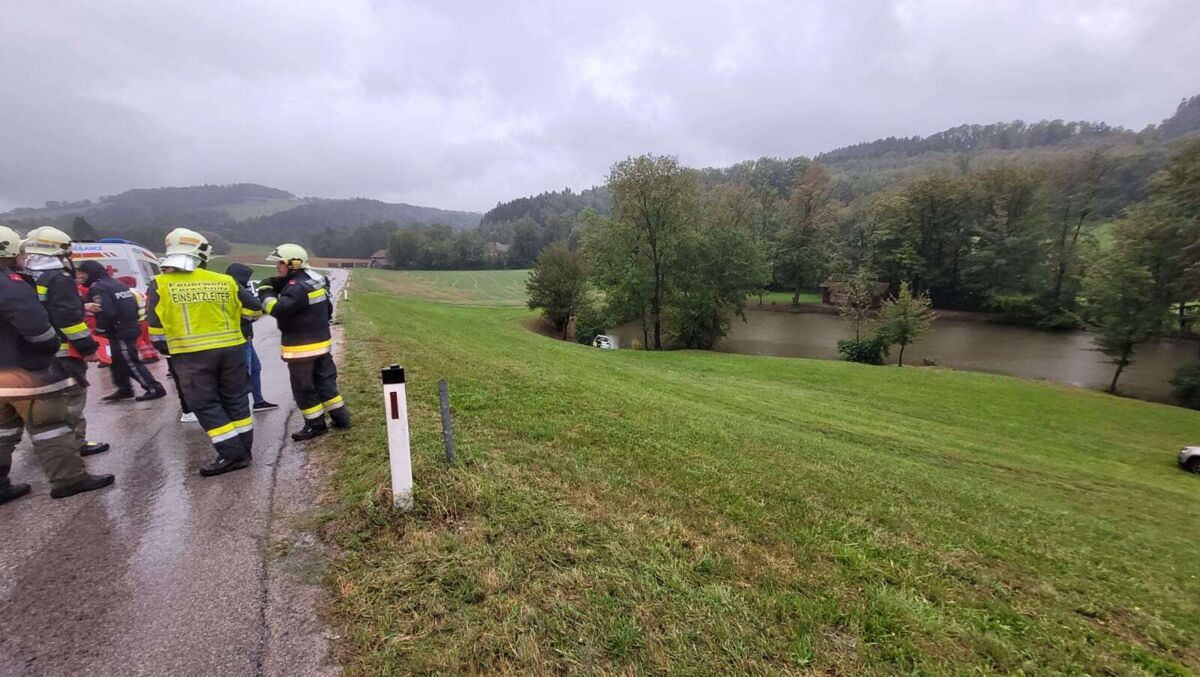 Feuerwehren zu Unfall in Ferschnitz ausgerückt: Auto in Teich gelandet