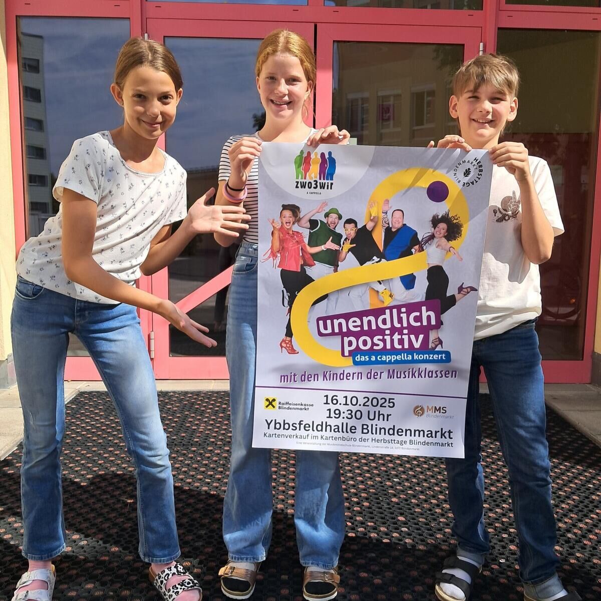 Mit dem Konzertprogramm „unendlich positiv“ nimmt das Ensemble dieses Mal die Kinder der Musikmittelschule mit auf seine Reise. Gemeinsam mit den Schülern der Musikklassen musizieren Zwo3wir auf der Bühne der Ybbsfeldhalle.