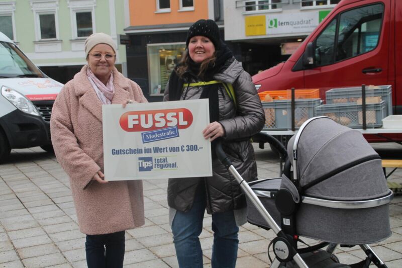 Der Besuch des Bauernmarktes hat sich für die Amstettnerin Michaela Müller-Guttenbrunn diesmal definitiv ausgezahlt: Sie traf dort auf das Glücksengerl in Gestalt von Tips-Redakteurin Karin Novak, die ihr die entscheidende Frage nach ihrer Lieblings-Gratiszeitung stellte. Müller-Guttenbrunn lieferte mit einem überzeugten „Die Tips!“ prompt die richtige Antwort und erhielt dafür 300 Euro-Gutscheine der Fussl Modestraße.