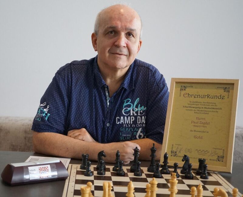 AMSTETTEN. Für seinen jahrzehntelangen Einsatz im Schachwesen hat der NÖ Schachverband Paul Zapfel das Ehrenzeichen in Gold verliehen. Übergeben wurde es von Winfrid Wadsack, NÖ Landesspielleiter und Obmann des Schachklubs Amstetten.