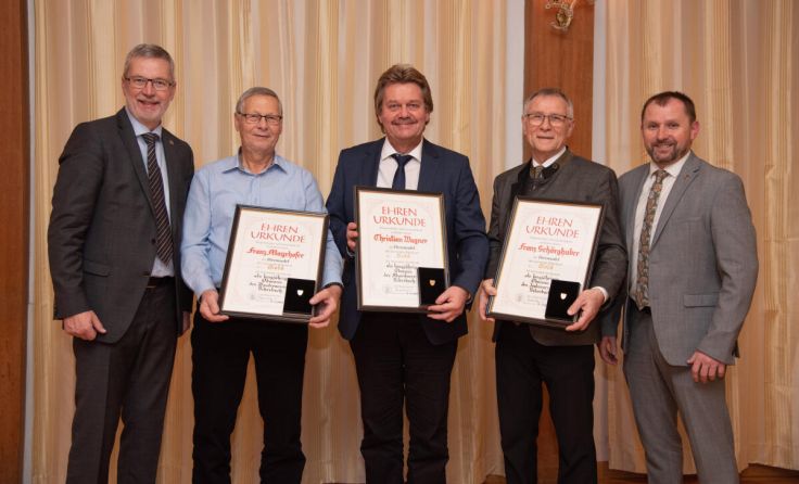 BIBERBACH. Die drei Biberbacher Franz Mayrhofer, Franz Schörghuber und Christian Wagner wurden für ihre Verdienste um die Gemeinde geehrt und erhielten die Ehrennadel in Gold.