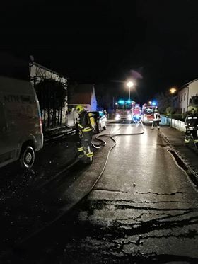 Am Einsatzort fanden die Löschkräfte einen Vollbrand einer circa sechs Meter hohen Hecke auf einer Länge von rund 40 Meter vor, welcher bereits auf einen Kleintransporter übergegriffen hat. Mittels C-Löschleitung konnte der Angriffstrupp unter Verwendung von schweren Atemschutz den Brand glücklicherweise rasch eindämmen und die direkte Brandbekämpfung durchführen, eine Ausbreitung auf das nahegelegene Wohngebäude konnte verhindert werden. Ein weiteres C-Rohr wurde parallel dazu aufgebaut und unterstützte anschließend die Löscharbeiten.
