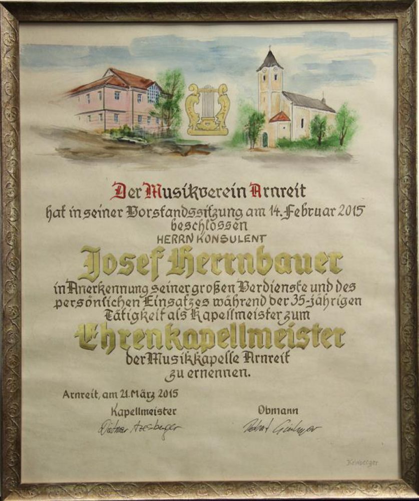 Für eine kleine, aber sehr lebenswerte Gemeinde ist es ein toller Erfolg, wenn in 67 Jahren nur 2 Kapellmeister benötigt wurden. So hat Ehrenkapellmeister Konsulent Josef Herrnbauer 1980 die Musikkapelle von Konsulent Josef Steininger übernommen. Unser Sepp Steininger hat die Kapelle 32 Jahre geleitet, aber Josef Herrnbauer hat ihn noch übertroffen. Ganze 35 Jahre stand er der Kapelle als Kapellmeister vor und dürfte somit zu den längst dienenden Kapellmeistern gehören.
