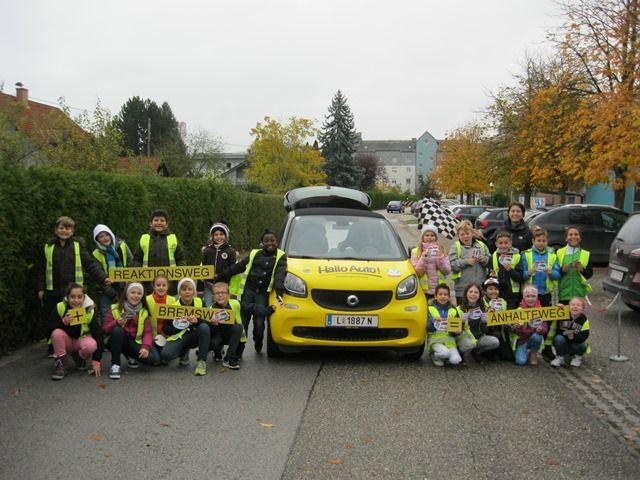 Bei „Hallo Auto!“ dürfen die Schüler in einem eigens umgebauten Kleinwagen vom Beifahrersitz aus eine Vollbremsung durchführen. Zuvor schätzen die Buben und Mädchen den Weg bis zum Stillstand des Autos. „Bei dieser spielerischen Übung wird den Kindern eindrucksvoll vermittelt, welche Auswirkungen die Reaktionszeit des Fahrers und die Geschwindigkeit des Fahrzeuges auf den Anhalteweg haben. Groß ist das Staunen, wenn die Schüler sehen, wie lang der Weg tatsächlich ist. Es ist wichtig zu wissen, dass ein Auto eben nicht sofort stehen bleiben kann“, so Riener. Bei „Hallo Auto!“ werden auch wichtige Fragen, wie „Was bewirkt die Geschwindigkeit?“, „Welche Rolle spielen die Reifen?“, „Gibt es einen Unterschied auf nasser Fahrbahn?“ oder „Wie lange ist mein Bremsweg?“ beantwortet.