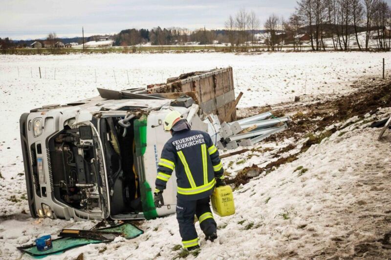 NEUKIRCHEN AN DER ENKNACH. In Neukirchen an der Enknach ist am späten Freitagvormittag ein Lastwagen von der Lamprechtshausener Straße abgekommen und umgestürzt.
