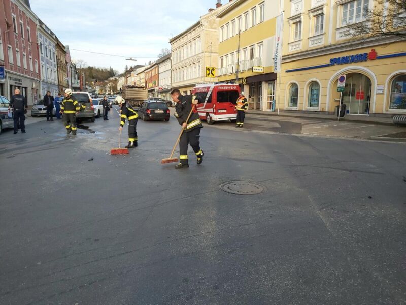Bereits am Mittwoch war die Feuerwehr Mauerkirchen bei einem Verkehrsunfall am Marktplatz Mauerkirchen im Kreuzungsbereich der B 142 mit dem Untermarkt im Einsatz. Sofort wurde die Verkehrsregelung der anwesenden Polizei durch Feuerwehrlotsen ergänzt und die ausgetretenen Betriebsmittel gebunden. Nach der Unterstützung der Abschleppunternehmen konnten die 23 ausgerückten Mitglieder die Einsatzbereitschaft wiederherstellen.