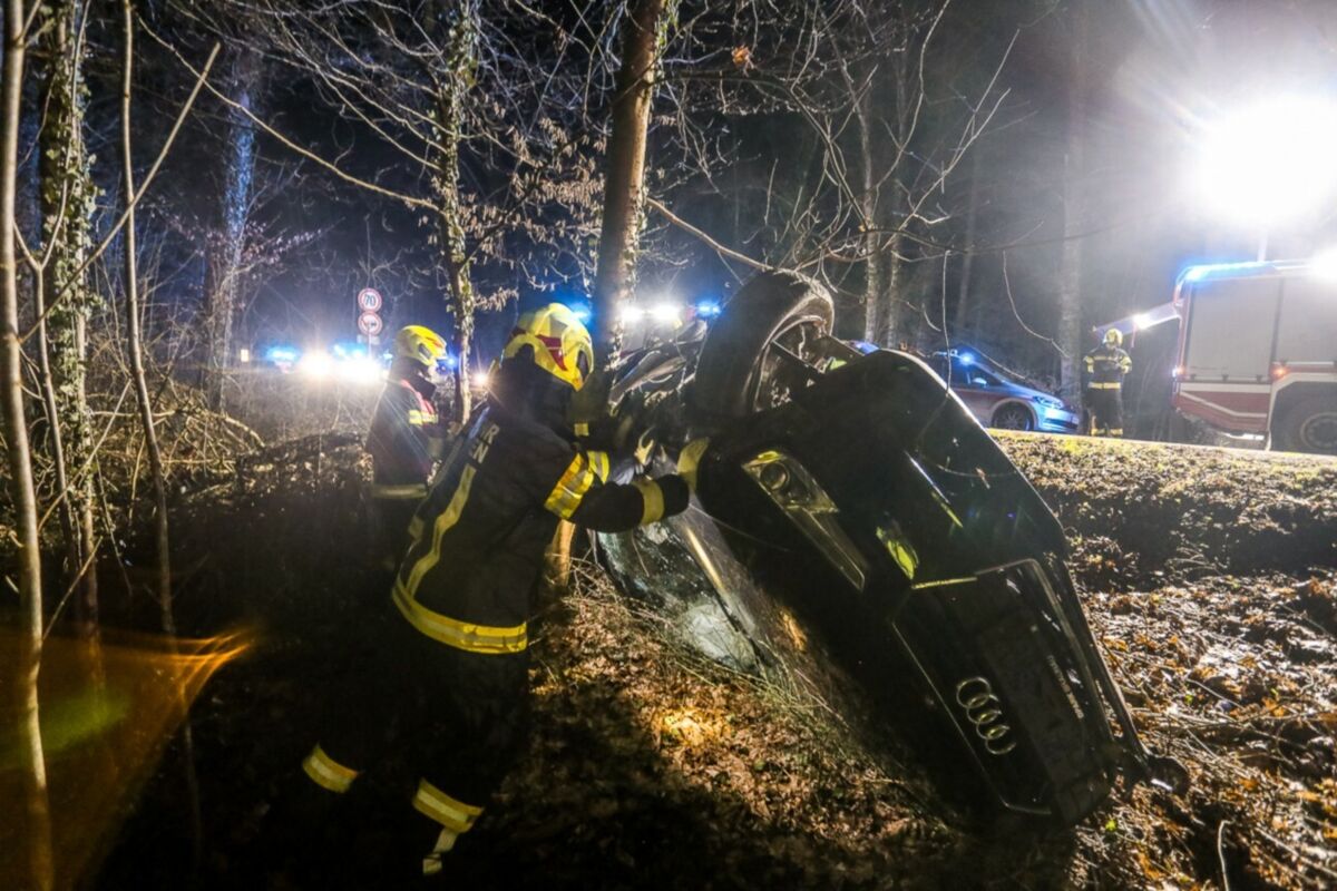 Ein Fahrzeug wurde in die Böschung geschleudert, ein weiterer Pkw kam schwer beschädigt auf der Straße zum Stillstand und ein Auto überschlug sich und kam in Schräglage nahezu am Dach liegend zum Stillstand. Die Einsatzkräfte von vier Feuerwehren wurden zur Personenrettung alarmiert und führten diese gemeinsam mit den anwesenden Rettungsdiensten und dem Notarzt durch.Die B156 Lamprechtshausener Straße war im Bereich der Unfallstelle für knapp zwei Stunden gesperrt.