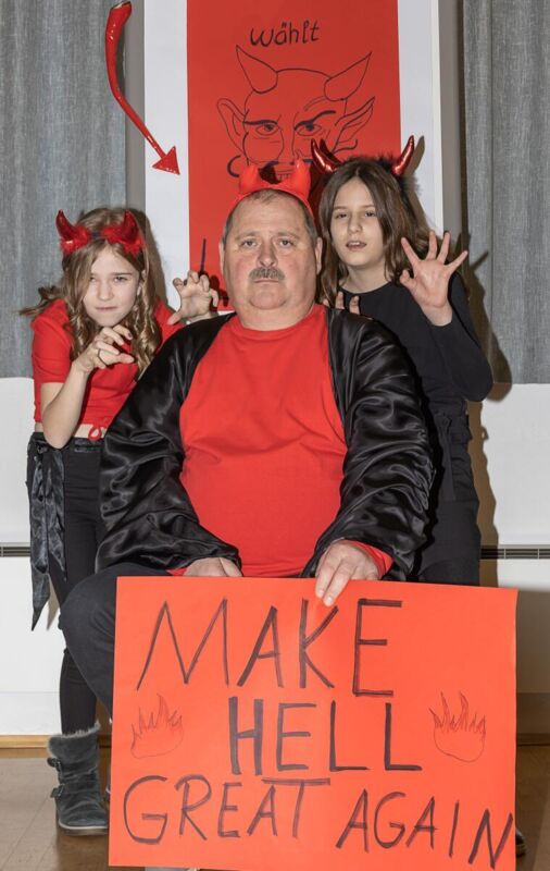 LENGAU. Das RiesenTheater Lengau spielt die Tragikomödie „Luzifers Nöte mit der Demokratie“ von Rolf Stemmle unter der Regie von Gerard ES im April im Volksheim Schneegattern.