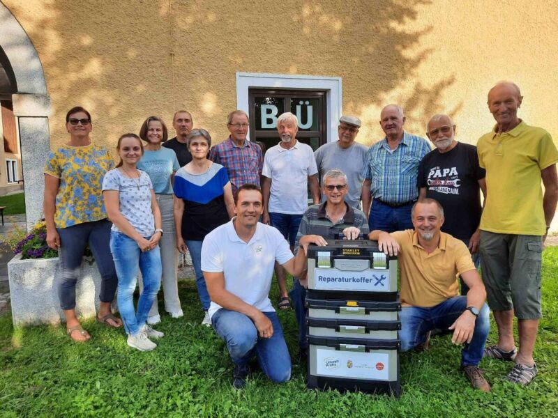 Unter dem Motto „Reparieren statt Wegwerfen“ repariert ein Team von Freiwilligen von 18 bis 20 Uhr in geselliger Runde alle möglichen Alltagsgegenstände. Nun stellt der Bezirksabfallverband (BAV) dem RepairCafe Feldkirchen einen Reparaturkoffer mit vielerlei Werkzeug als Dauerleihgabe zur Verfügung. Die Übergabe durch Johannes Wipplinger vom BAV.