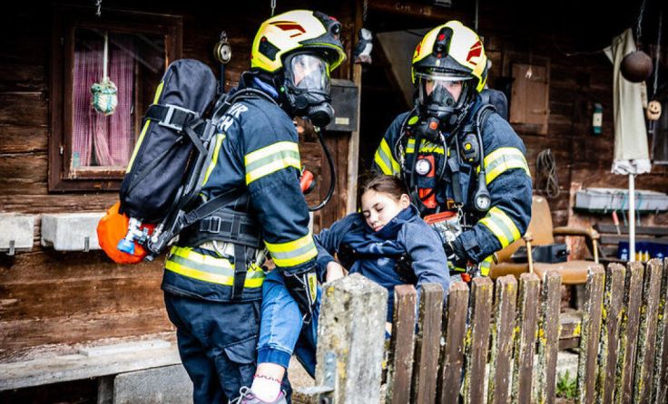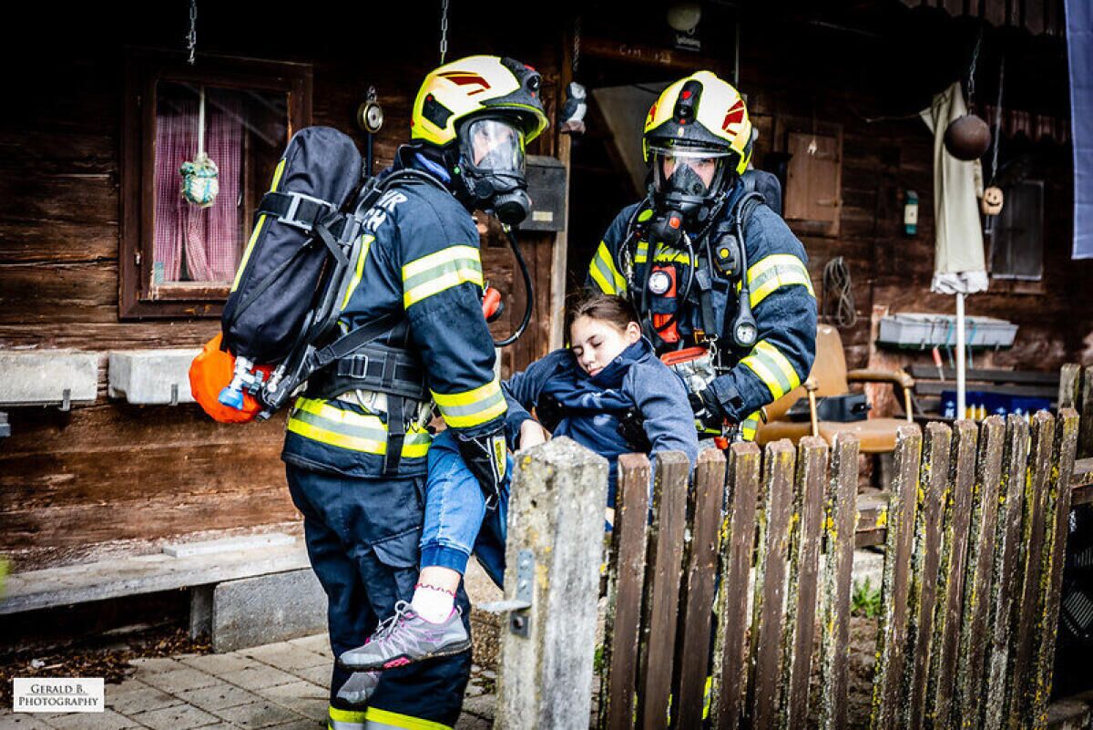 Die Rettungstrupps retteten mit schwerem Atemschutz sechs Personen aus dem stark verrauchten und simuliert brennenden Haus. Zwei weitere Personen wurden aus einer Zwangslage gerettet.