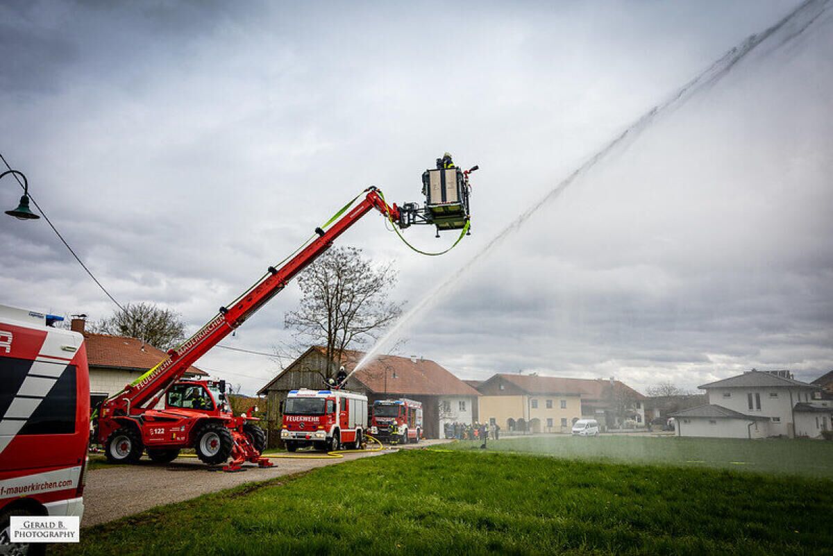 MAUERKIRCHEN/MOOSBACH. Bei ihrer Frühjahrsübung simulierten die Freiwilligen Feuerwehren Mauerkirchen und Moosbach einen ausgedehnten Dachstuhlbrand.