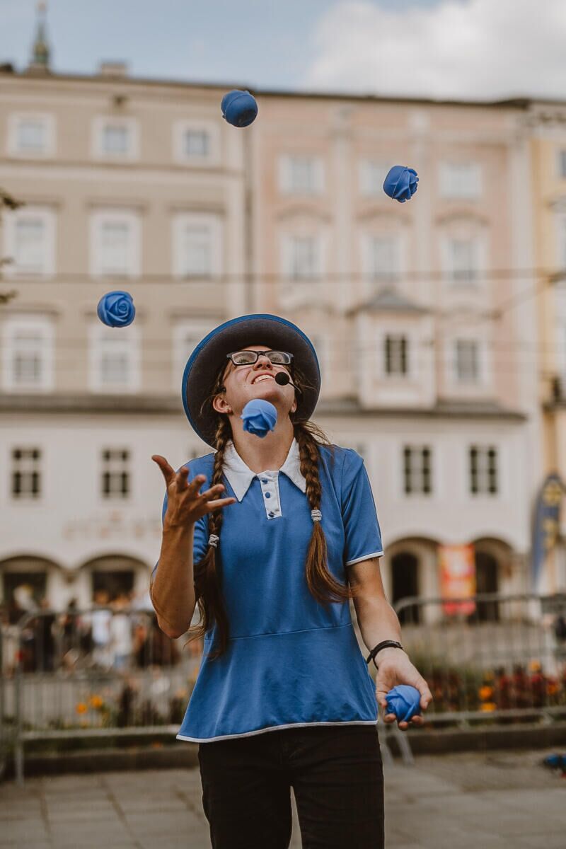 Auch Jonglina ist auf dem Markt unterwegs. Die oberösterreichische Künstlerin und Artistin bietet Jongliershows und einen XXL-Mitmachzirkus an. Für den Josefimarkt ist das Programm „Walking Act“ gebucht.