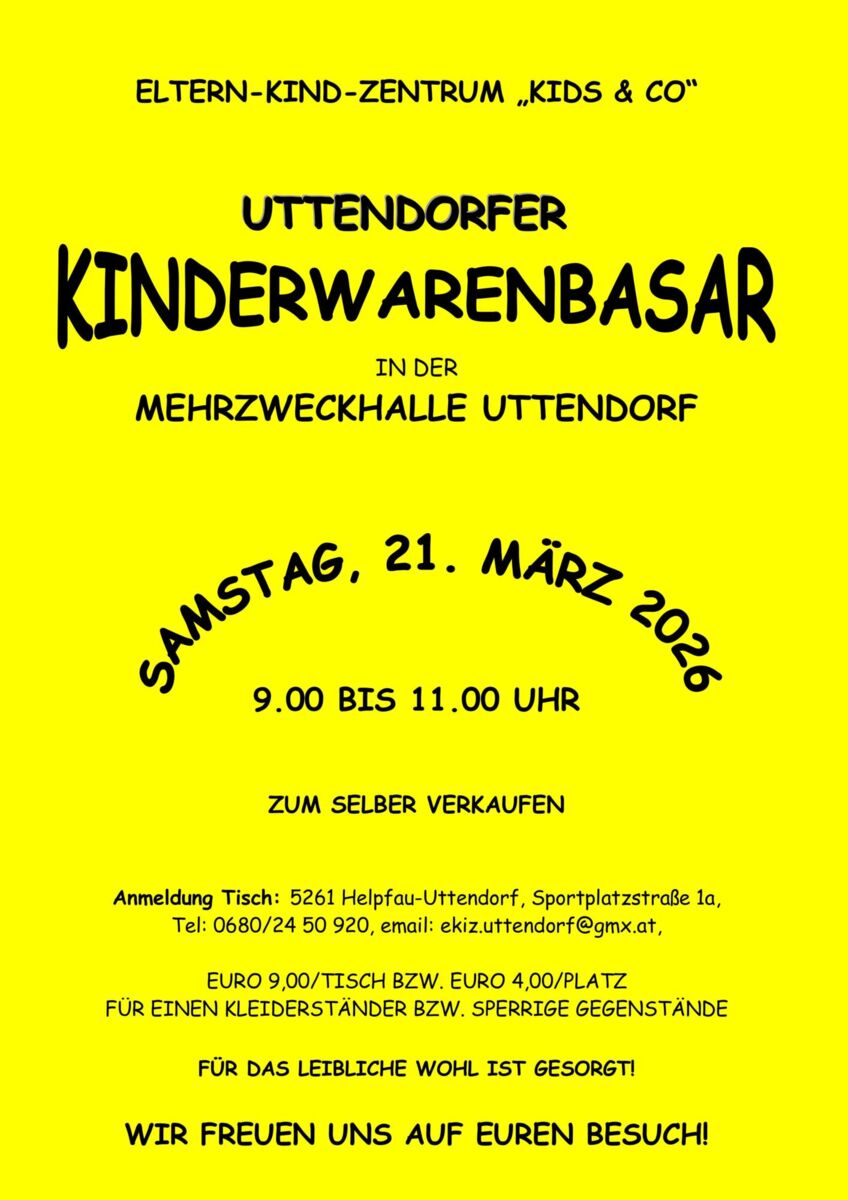 HELPFAU-UTTENDORF. Am 21. März 2026 findet von 9 bis 11 Uhr der beliebte Kinderwarenbasar in der Uttendorfer Mehrzweckhalle statt.