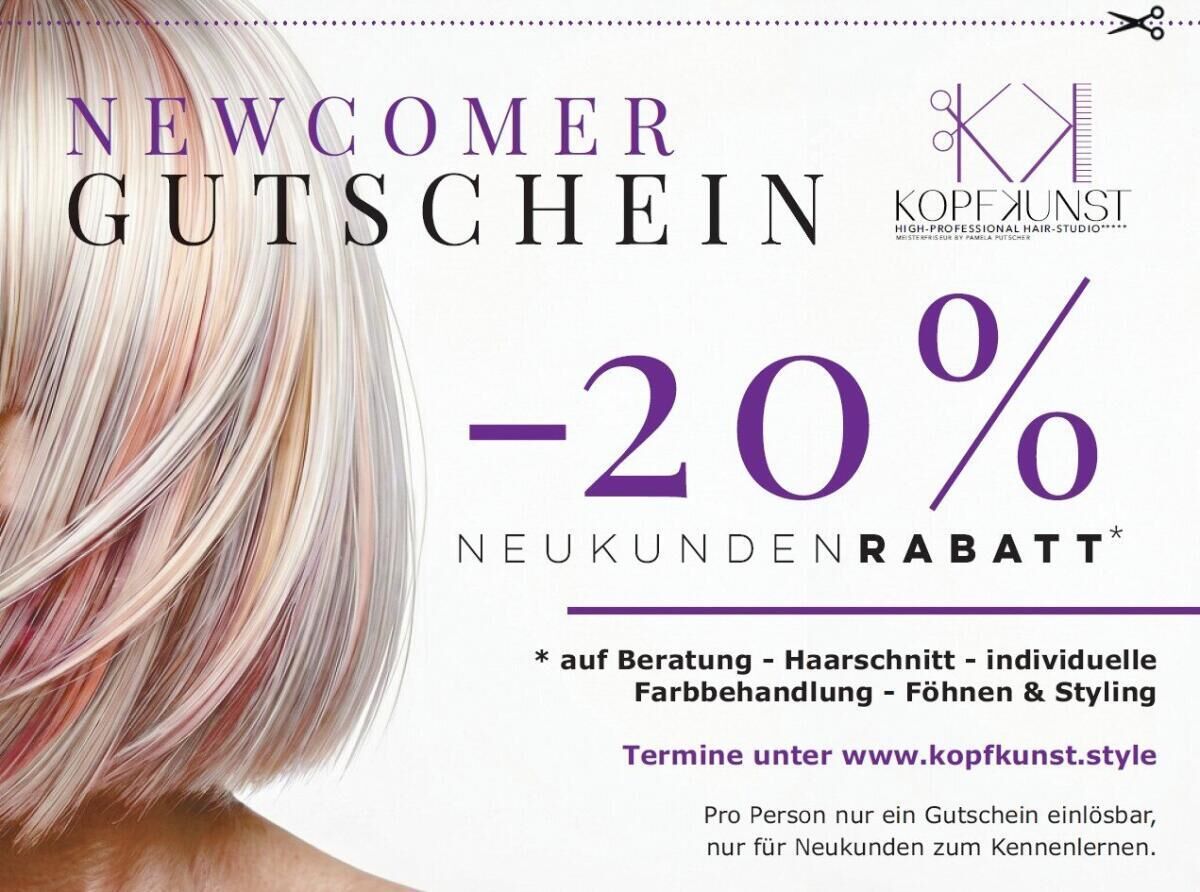 Für alle, die Kopfkunst erstmals kennenlernen möchten, gibt es aktuell einen besonderen Vorteil: Neukunden erhalten einen Rabatt von 20 Prozent auf Beratung, Haarschnitt sowie individuelle Farbbehandlungen inklusive Föhnen und Styling. Der Gutschein ist einmal pro Person einlösbar und bietet die ideale Gelegenheit, sich selbst von der Qualität und dem Konzept des Salons zu überzeugen. Termine können bequem online vereinbart werden.