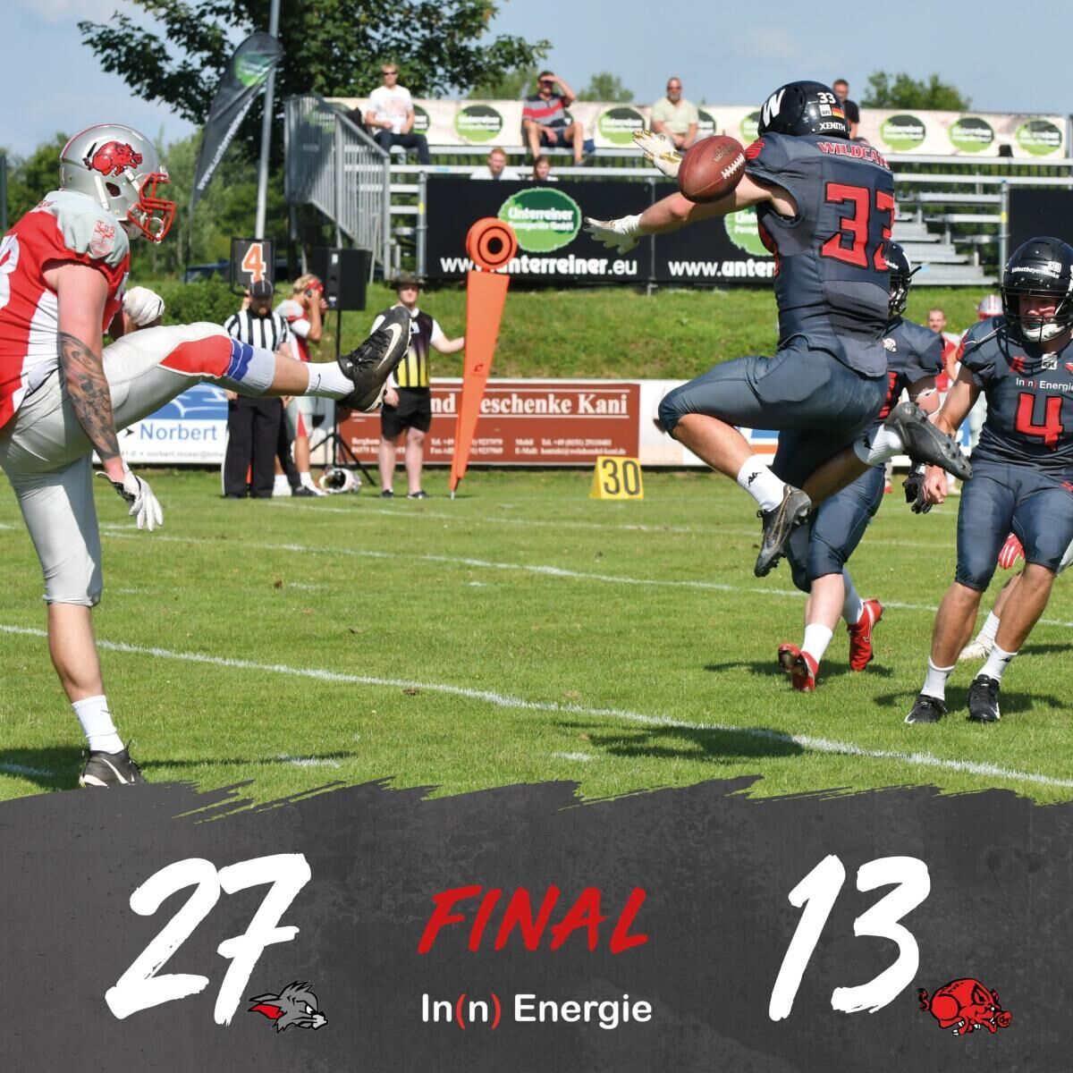 Damit konnten die Kirchdorfer ihren zweiten Tabellenplatz hinter den Ingolstadt Dukes behaupten. Nachdem zu Beginn der Partie keine Mannschaft ihren Rhythmus in der Offense finden konnte, zogen die Wildcats dann aber bis zur Halbzeit bereits auf 21:0 davon. Die Mannschaft von Headcoach Christoph Riener hat nun eine Woche Pause, bevor es am 25. Juni nach Wiesbaden auswärts zu den Phantoms geht. Für die Wildcats gilt es nun, sich etwas zu regenerieren und einige kleinere Verletzungen auszukurieren, bevor dann die heiße Phase der Saison beginnt.