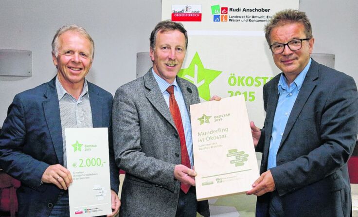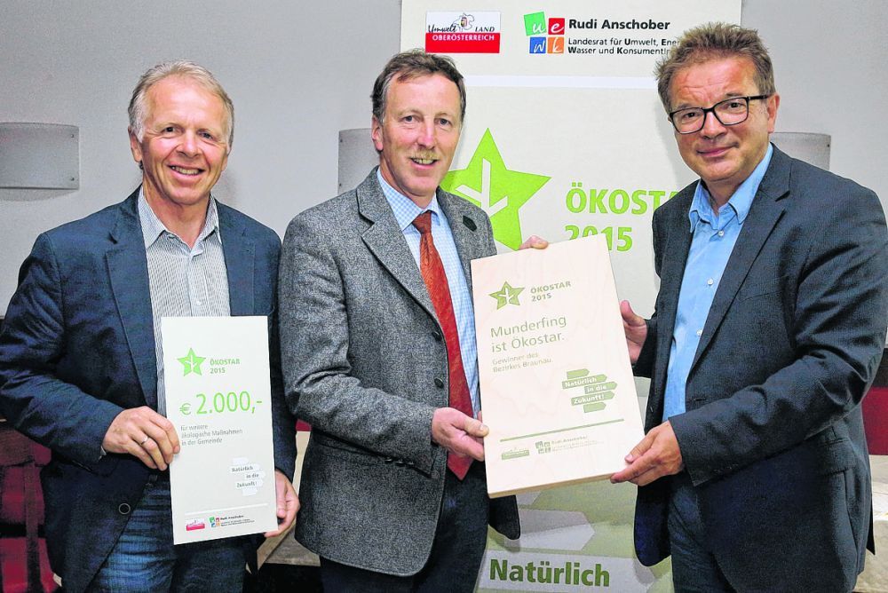 MATTIGHOFEN/MUNDERFING. Mit dem Ökostar 2015 will Landesrat Rudi Anschober (Grüne) die besten Gemeinden, Projekte und Unternehmen aus den Bereichen Umwelt, Energie, Klimaschutz und Nachhaltigkeit vor den Vorhang holen. Im Bezirk Braunau erhielten die Gemeinde Munderfing und die Berufsschule Mattighofen die Auszeichnung.