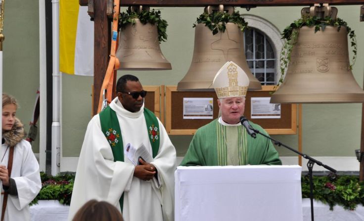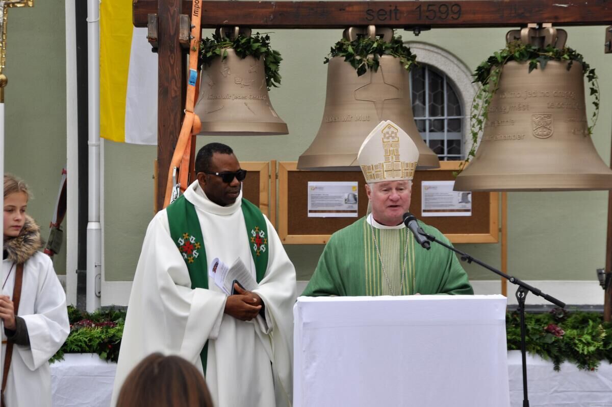 ASCHACH. Die neuen Bronzeglocken der Aschacher Pfarrkirche wurden von Dechant Anedu Paulinus, Pfarrer Josef Wundsam und Bischof Manfred Scheuer geweiht.