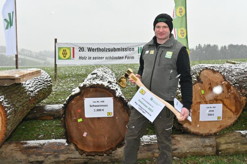 980 der schönsten und teuersten Baumstämme Oberösterreichs wurden in den vergangenen Wochen bei der 20. Wertholzsubmission in St. Florian, durchgeführt vom Waldverband OÖ und der Landwirtschaftskammer OÖ, präsentiert und verkauft. Bei der Submission handelt es sich um eine Versteigerung für Laubholz. Eine Schwarznuss erzielte mit 3.300 Euro pro Festmeter das höchste Gebot. 125 Stämme erhielten Gebote jenseits von 1.000 Euro pro Festmeter.
