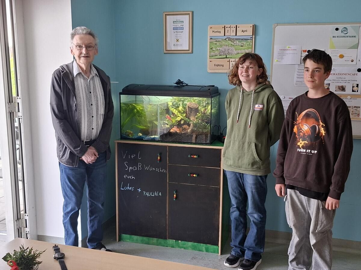 Lukas Pertlwieser und Paulina Pfanzagl haben seit Weihnachten an der Kombination aus Aquarium und Terrarium gearbeitet. Nun konnten sie es an die Bewohner des Bezirksalten- und -pflegeheims Eferding übergeben.